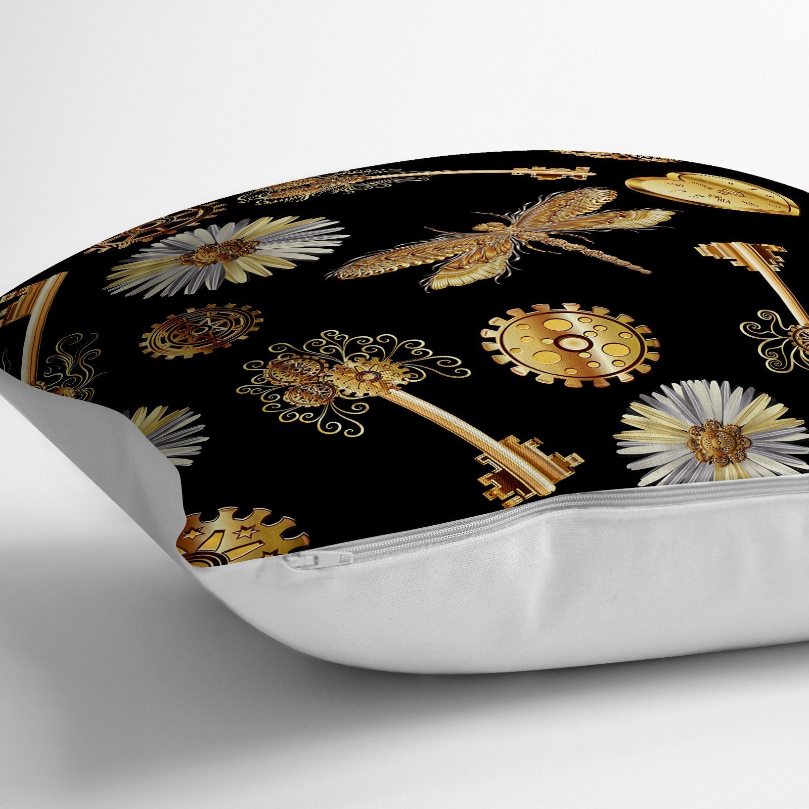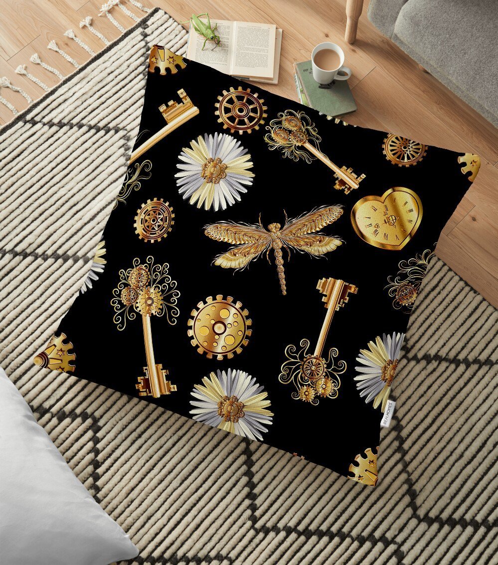Siyah Zeminde Etnik Objeler Özel Tasarımlı Yer Minderi – 70 x 70 cm