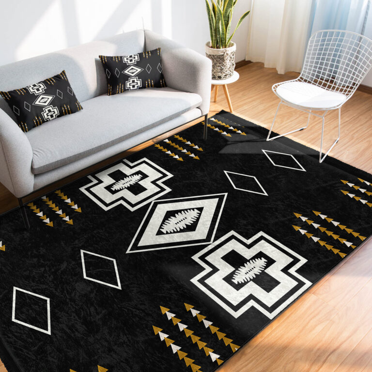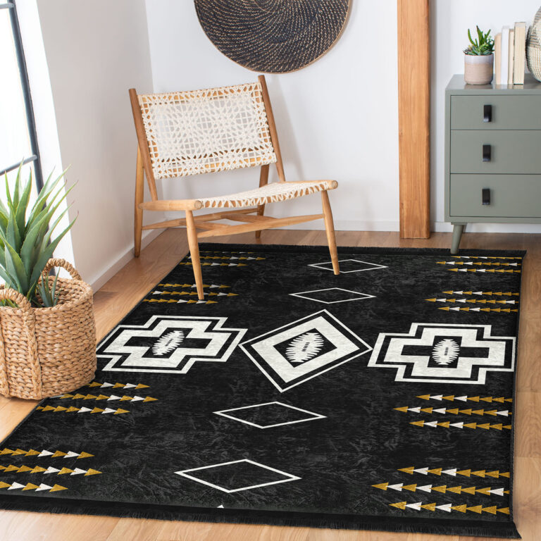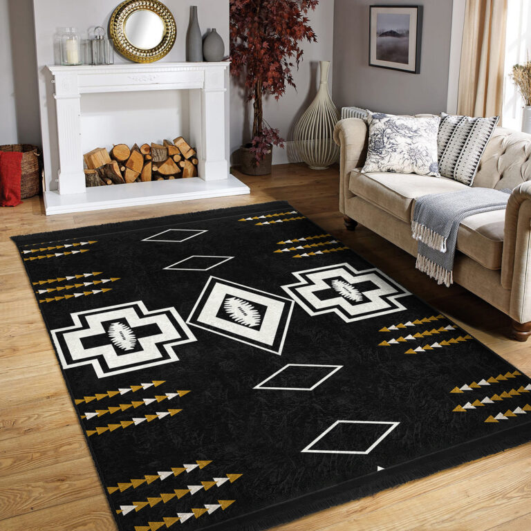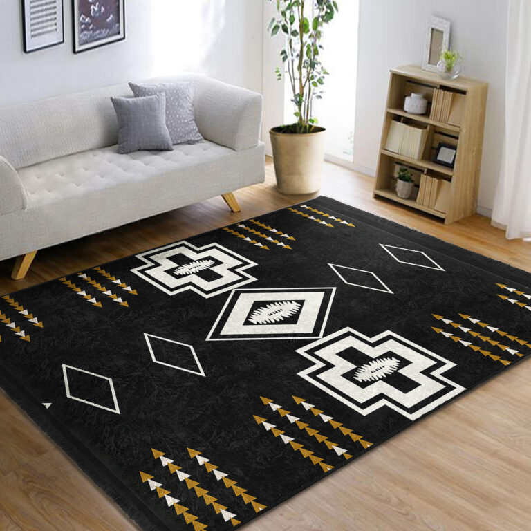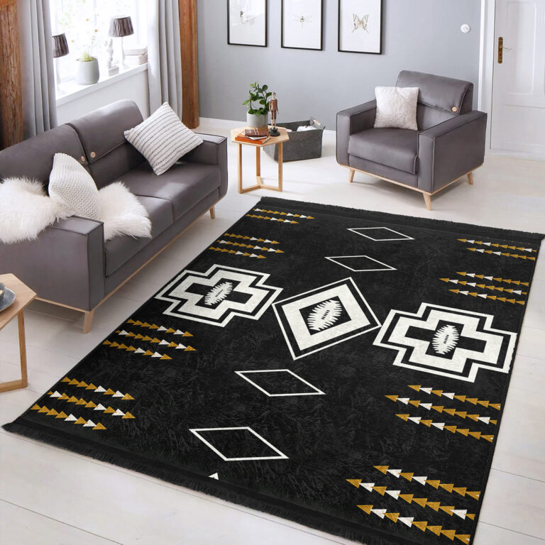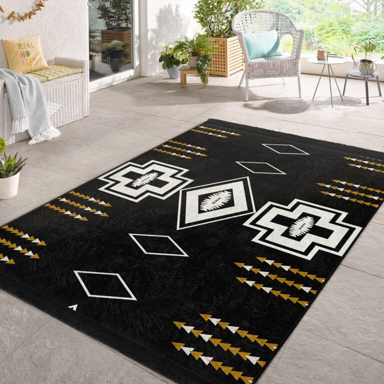 Siyah Zeminde Kilim Motifli Geometrik Desenli Vintage Geometrik Koridor & Antre Salon & Oturma Odası Dijital Baskılı Makinede Yıkanabilir Kaymaz Taban Saçaklı Halı