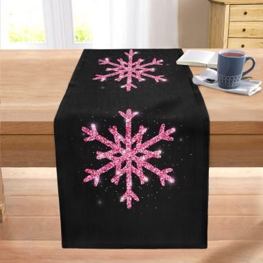 Siyah Zeminli Pembe Renkli Kar tanesi Desenli Dijital Baskılı Modern Dikişli Şönil Runner
