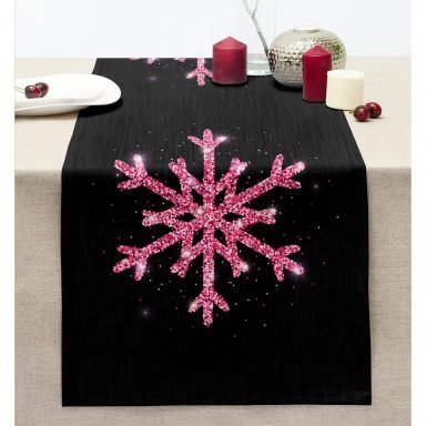 Siyah Zeminli Pembe Renkli Kar tanesi Desenli Dijital Baskılı Modern Dikişli Şönil Runner