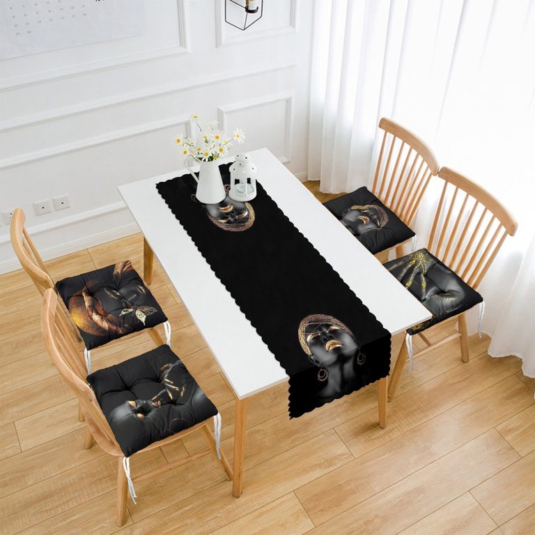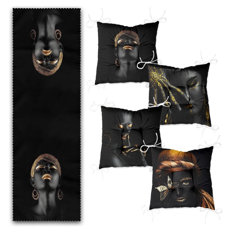 Siyahi Arap Kadın Tasarımlı 4 Pofidik Sandalye Minderi ve 1 Runner Seti