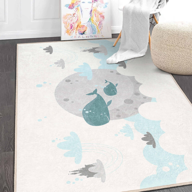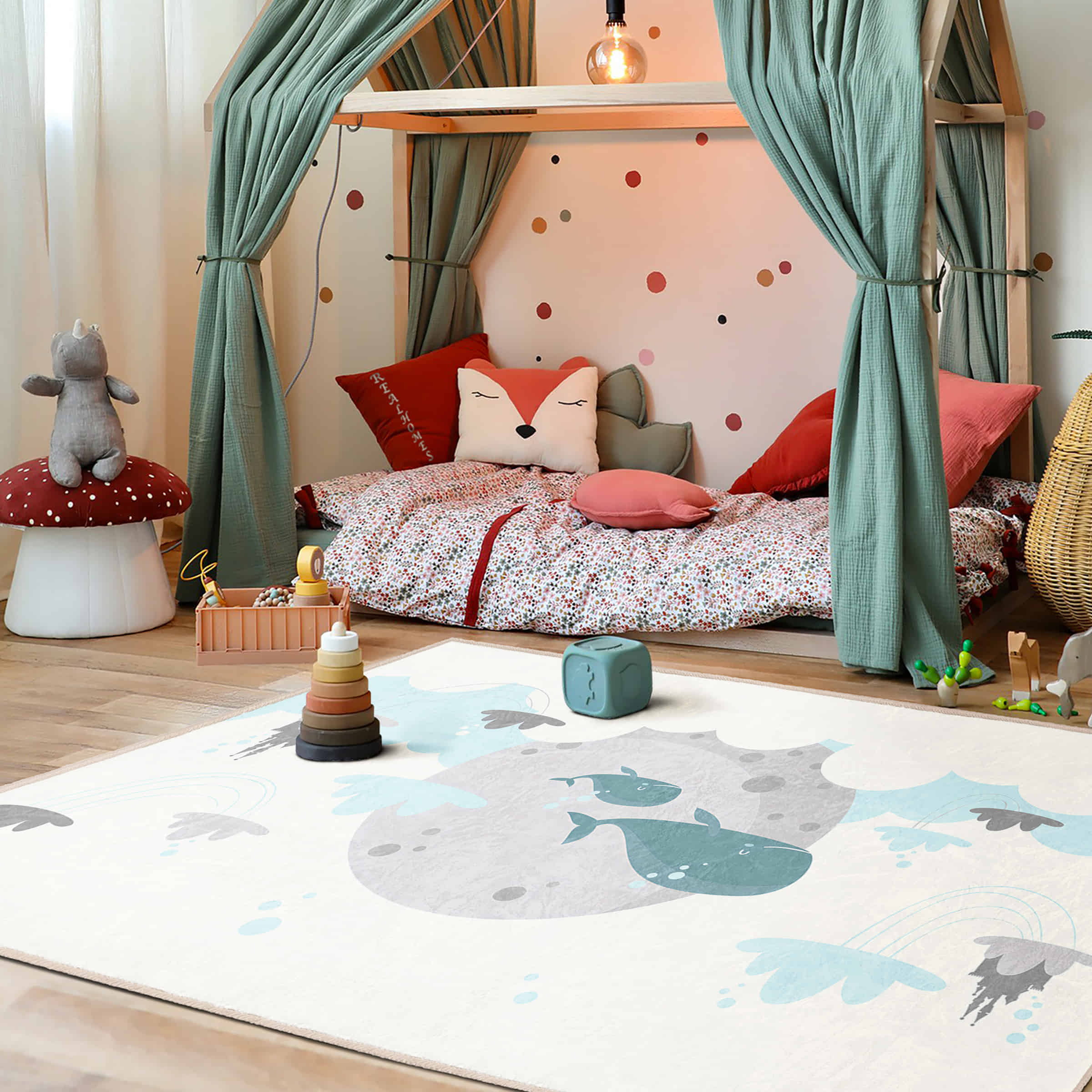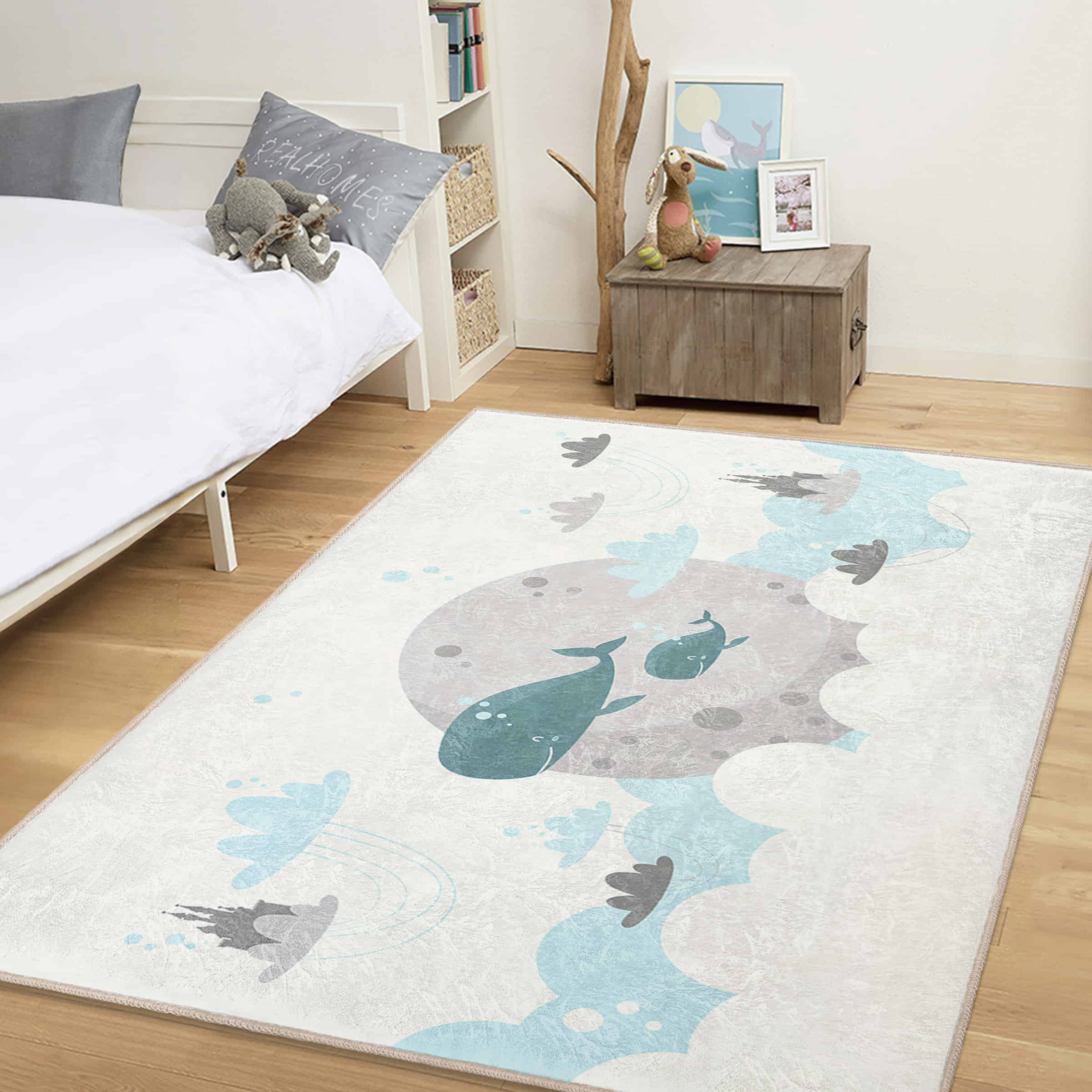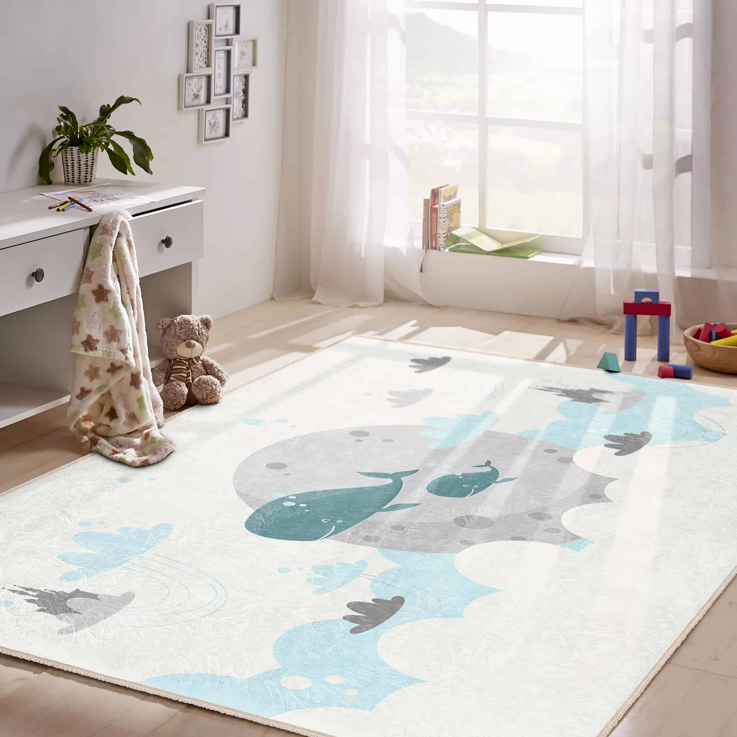 Su Altında Denizdeki Canlılar Temalı Renkli Makinede Yıkanabilir Kaymaz Taban Çocuk Halısı