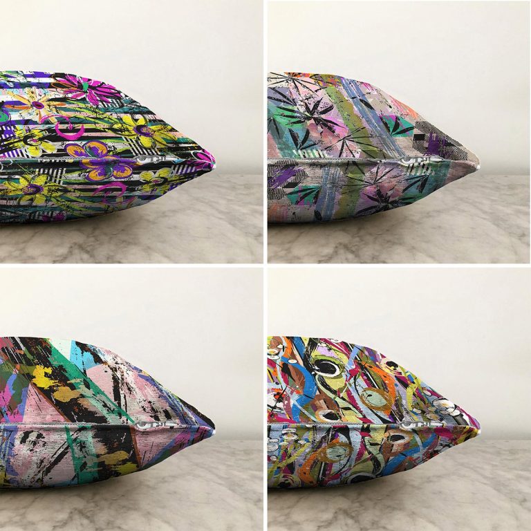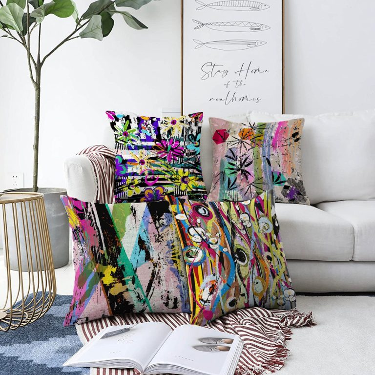 Sulu Boya Fırça Darbeli Geometrik Desenli 4’Lü Raşel Kadife Kırlent Kılıf Seti