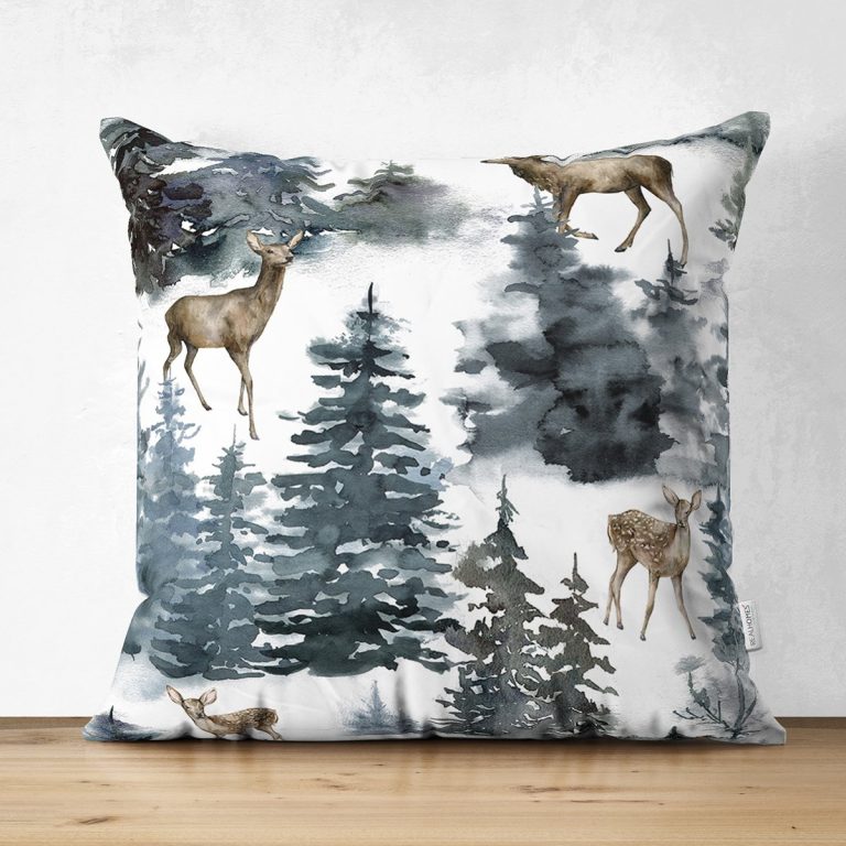 Suluboya Çam Ağacı & Geyik Tasarımlı Dijital Baskılı Modern Süet Yastık Kırlent Kılıfı