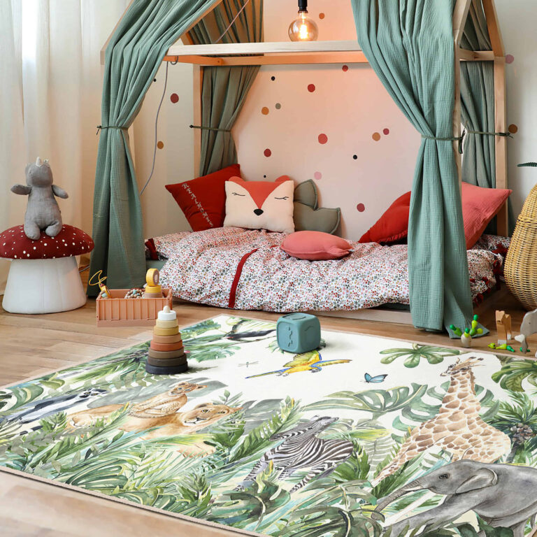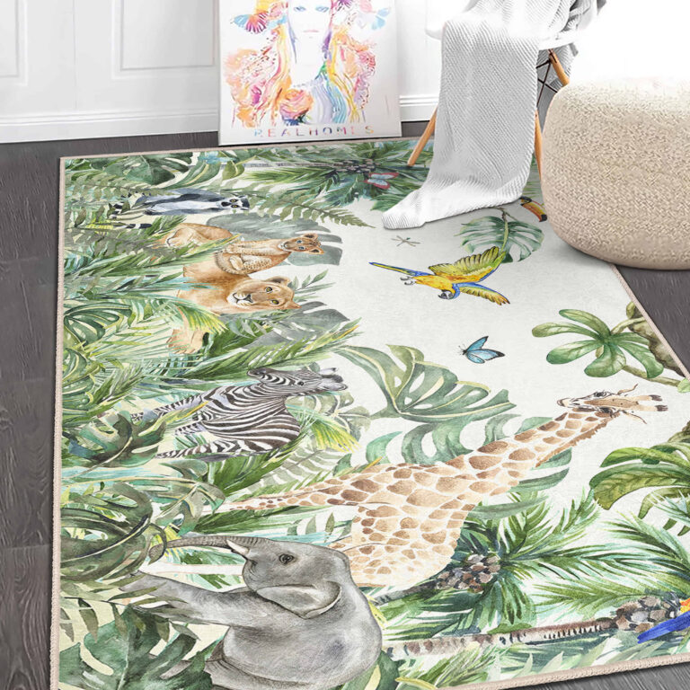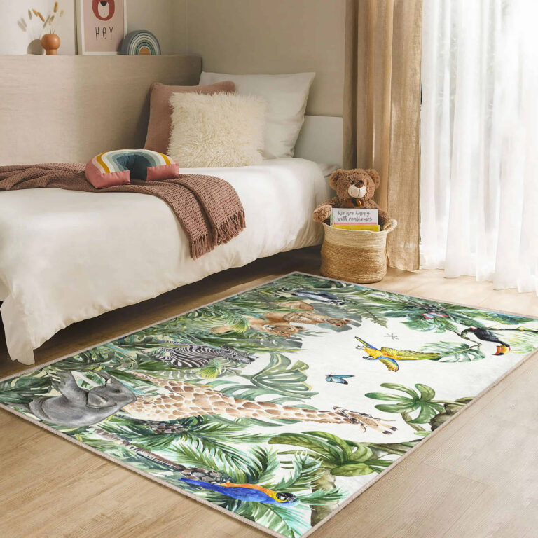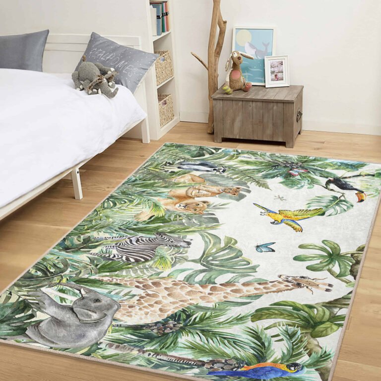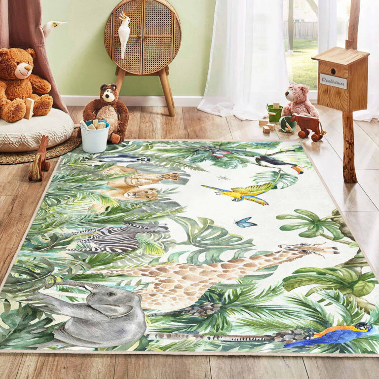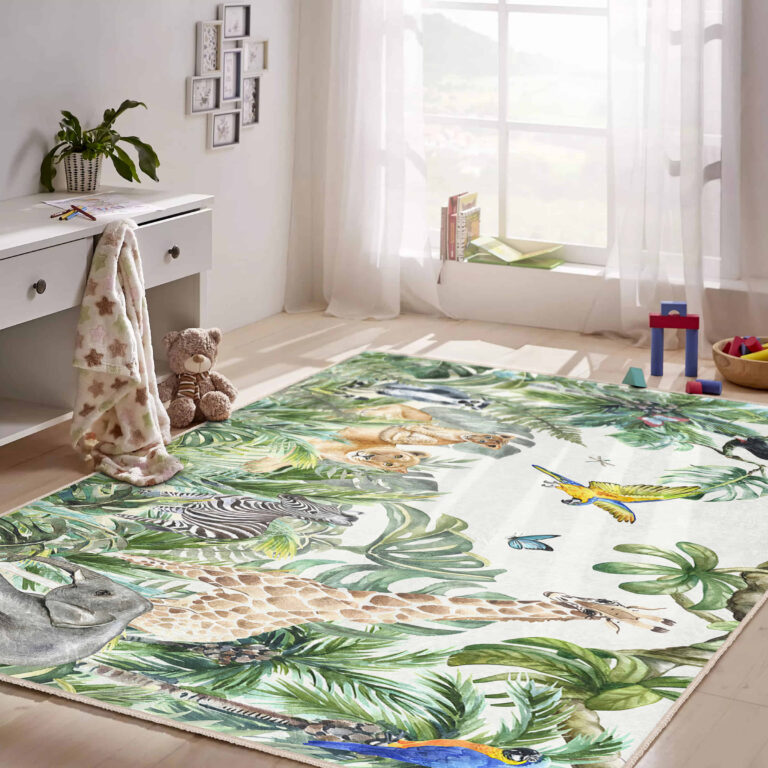 Tropikal Desenli Canlı Renklerle İşlenmiş Yıkanabilir Kaymaz Taban Çocuk Halısı
