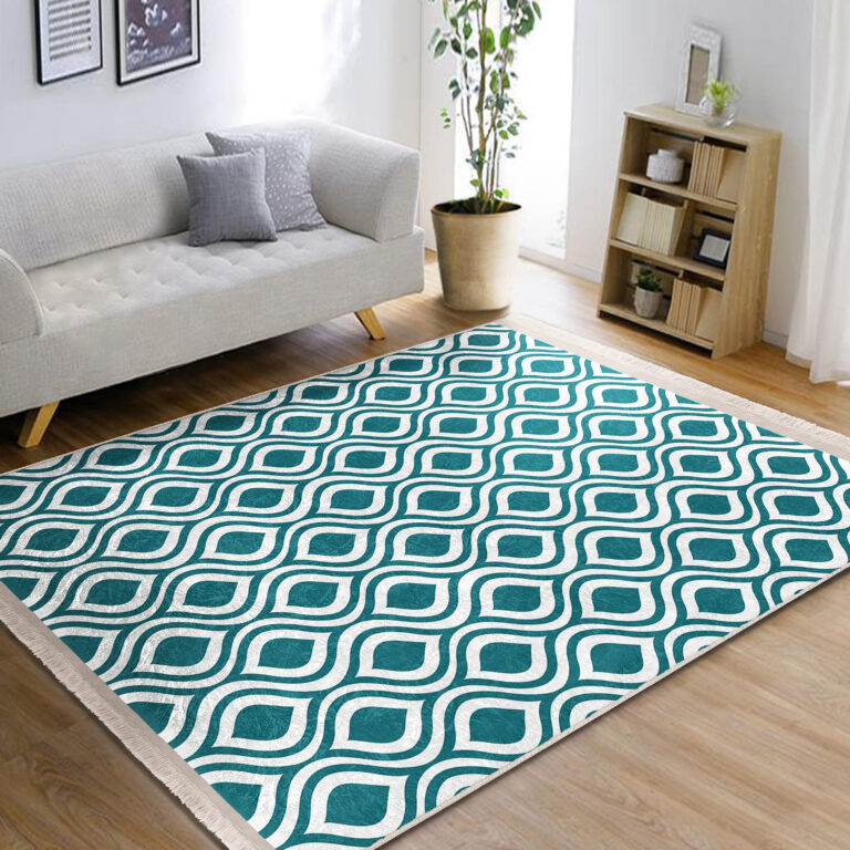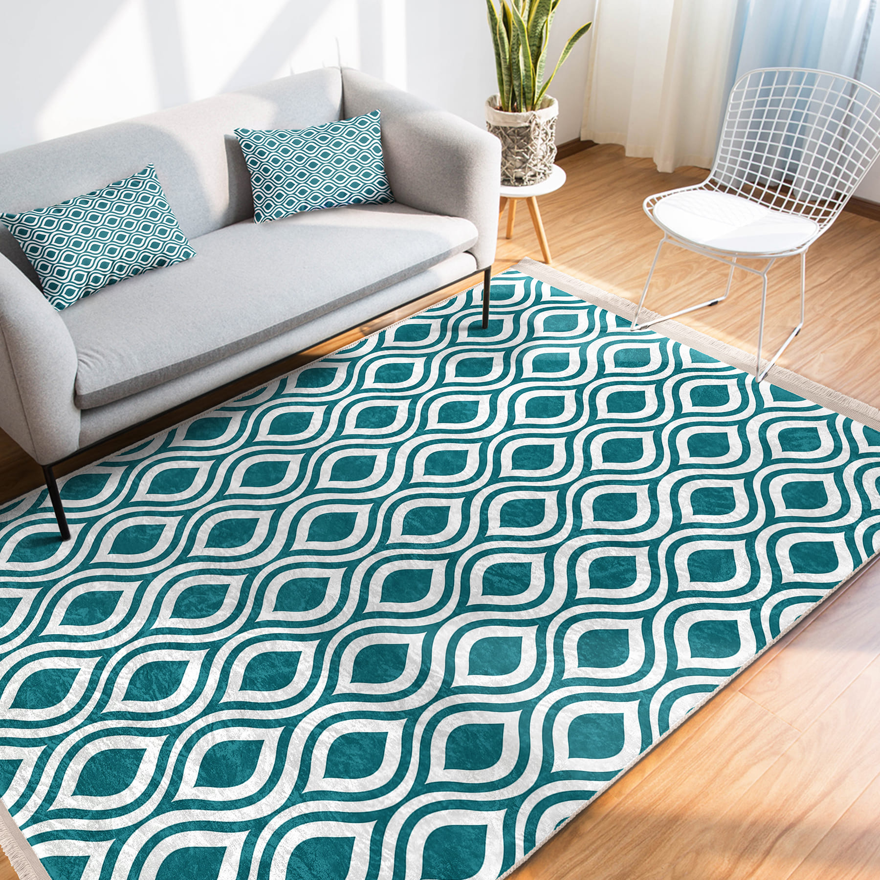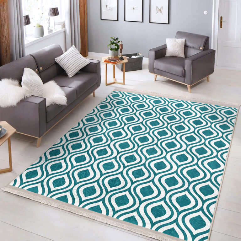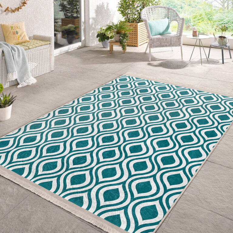 Turkuaz Zeminde Geometrik Motifli Klasik Desenli Geometrik Klasik Koridor & Antre Banyo Dijital Baskılı Makinede Yıkanabilir Kaymaz Taban Saçaklı Halı