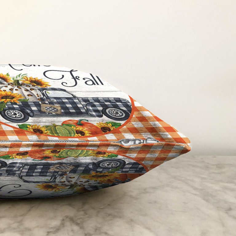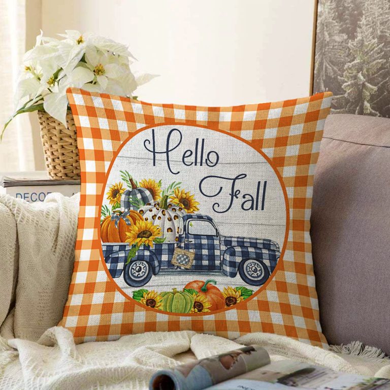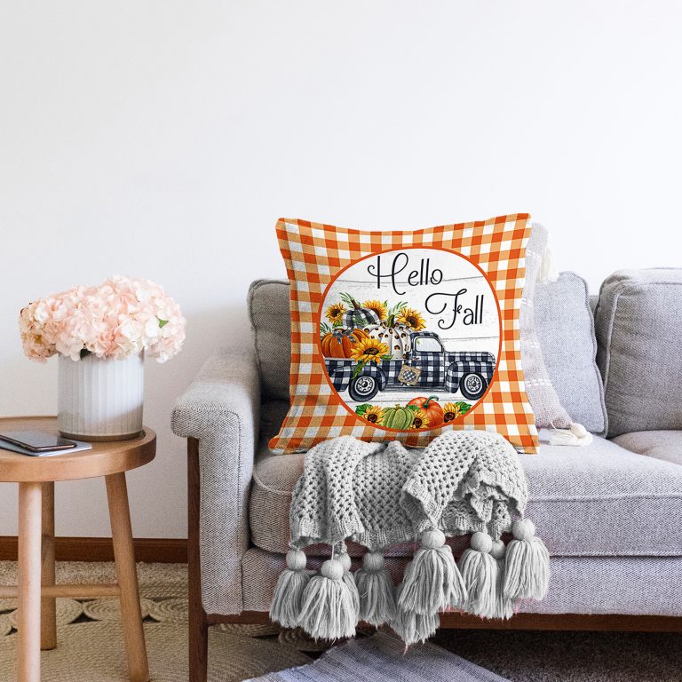 Turuncu Ekose Kabak Temalı Dijital Baskılı Modern Raşel Yastık Kırlent Kılıfı