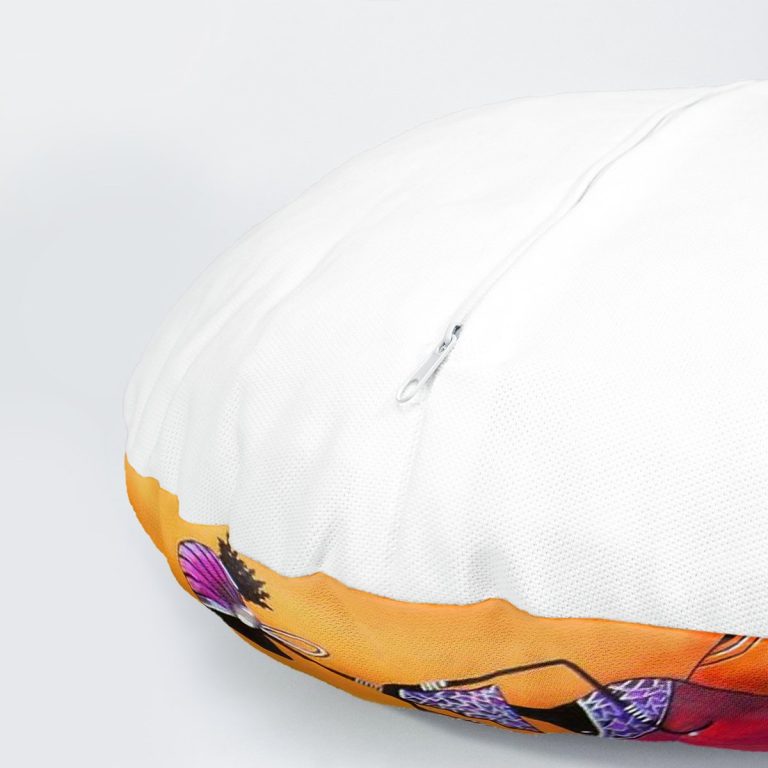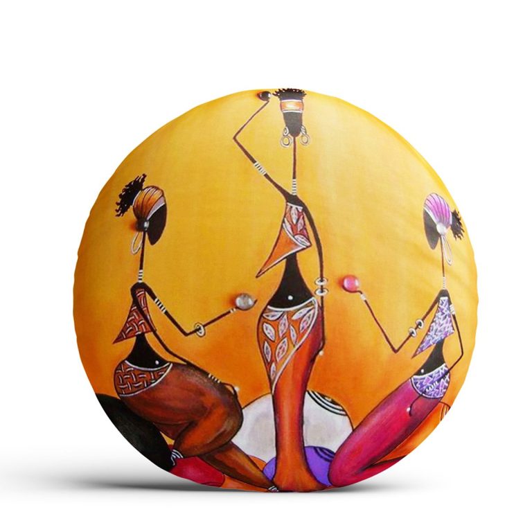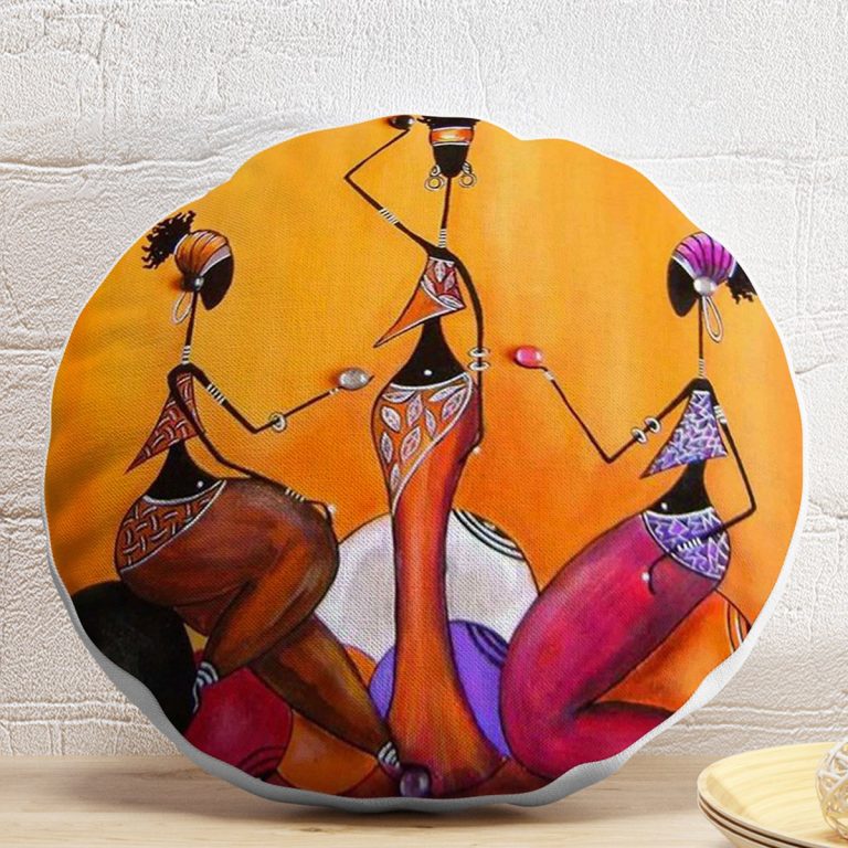 Turuncu Zemin Üç Afrikalı Kadın Çizimi Dijital Baskılı Dekoratif Yuvarlak Yastık Kırlent Kılıfı