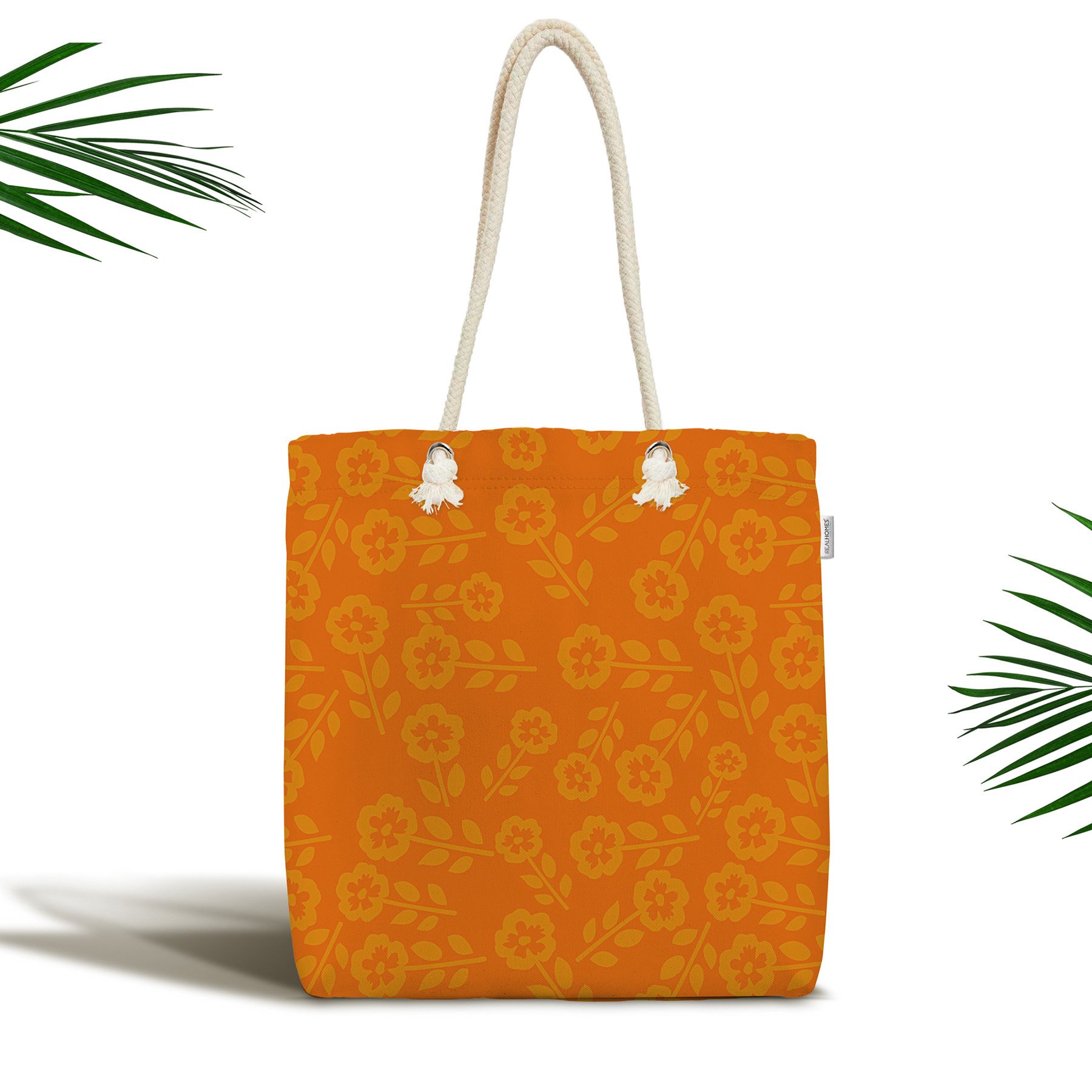 Turuncu Zeminli Papatya Motifli Dekoratif Fermuarlı Kumaş Plaj Çantası
