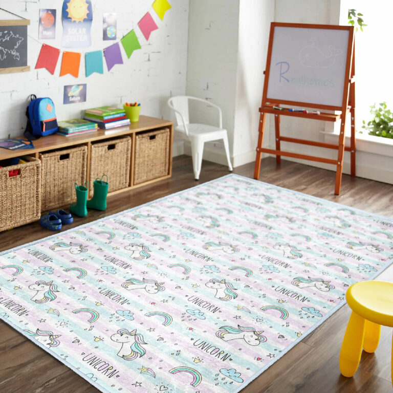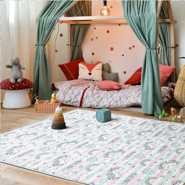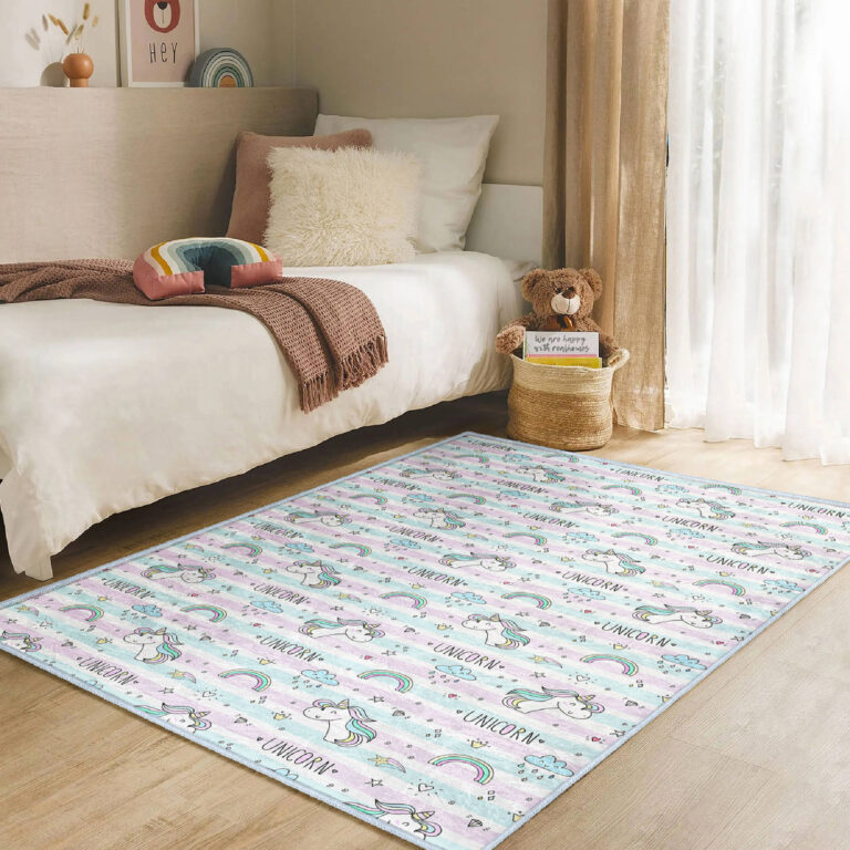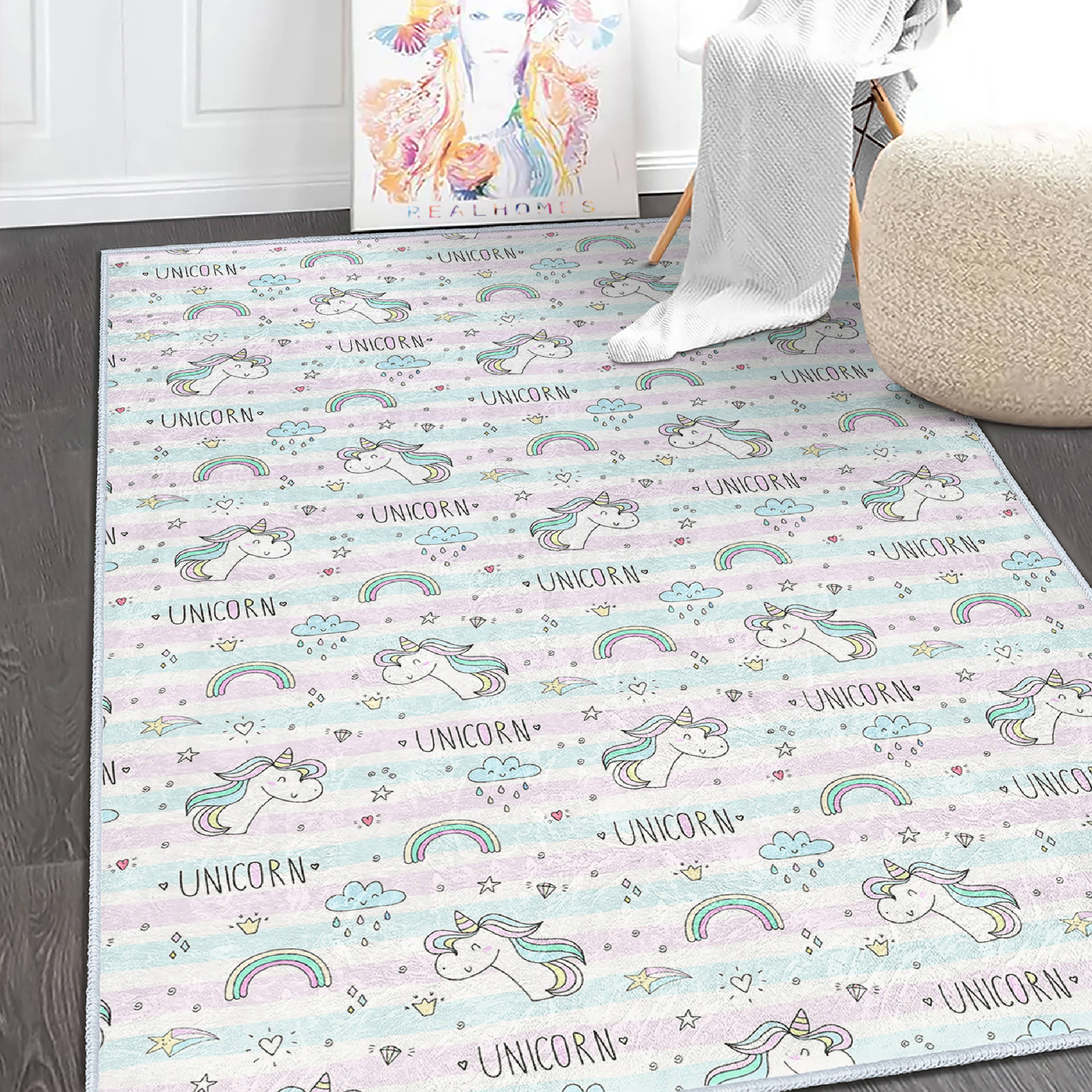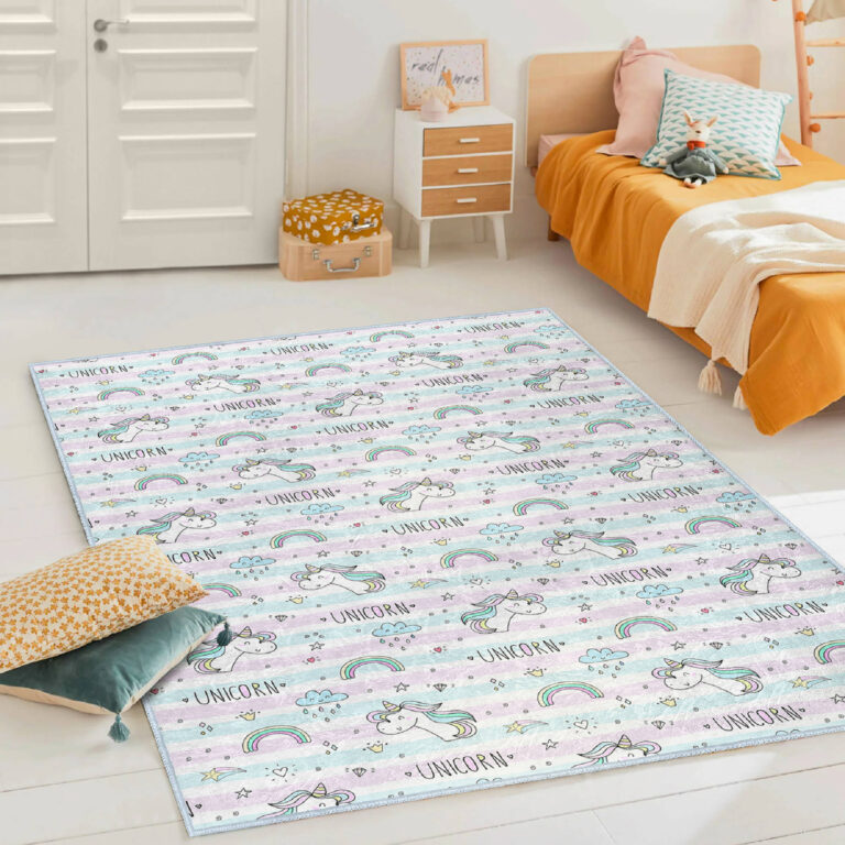 Unicorn Desenli Renkli Çocuk Halısı – Dikdörtgen Kaymaz Tabanlı Yıkanabilir Halı