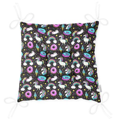 Unicorn Ve Donut Desenli Dijital Baskılı Özel Tasarım Modern Pofidik Sandalye Minderi