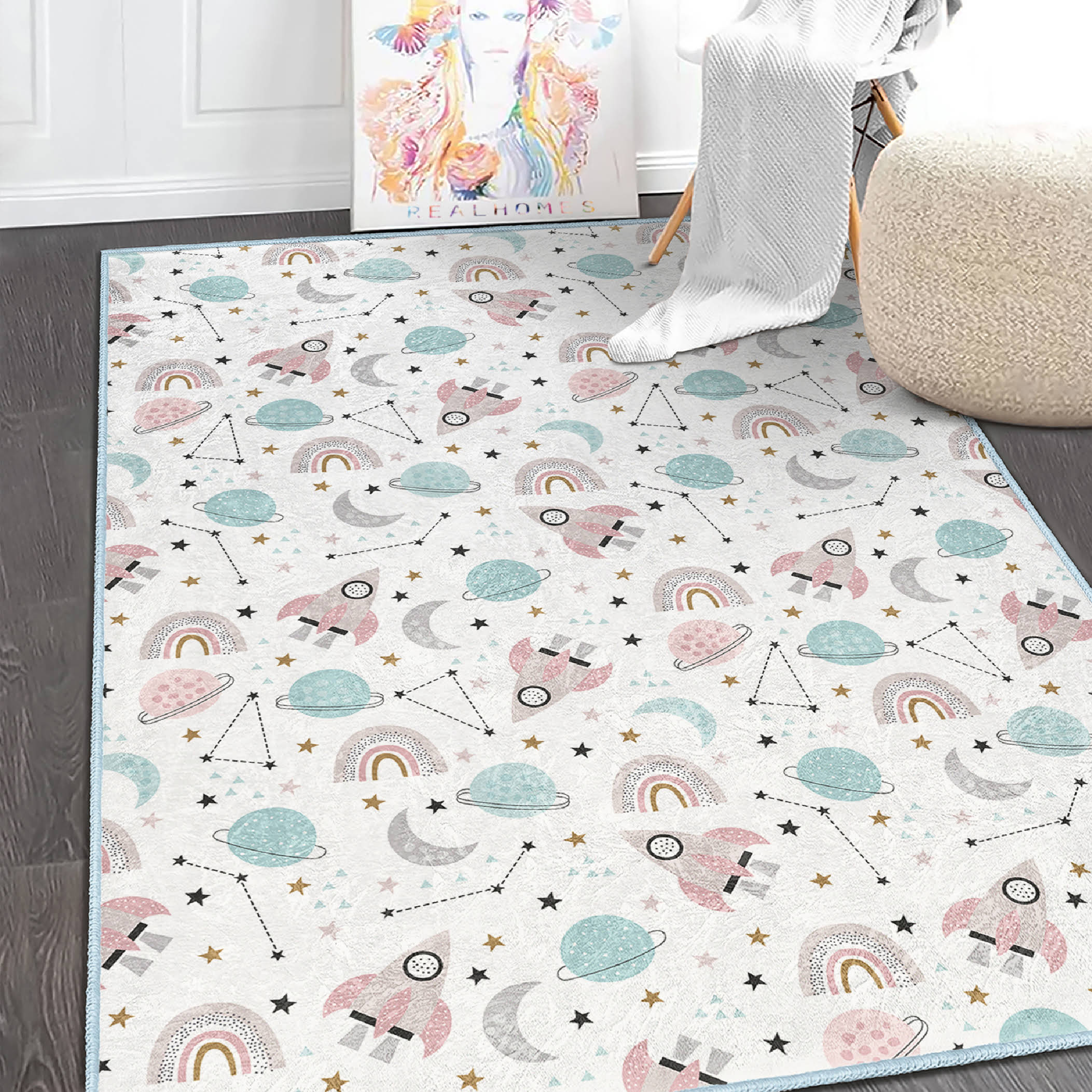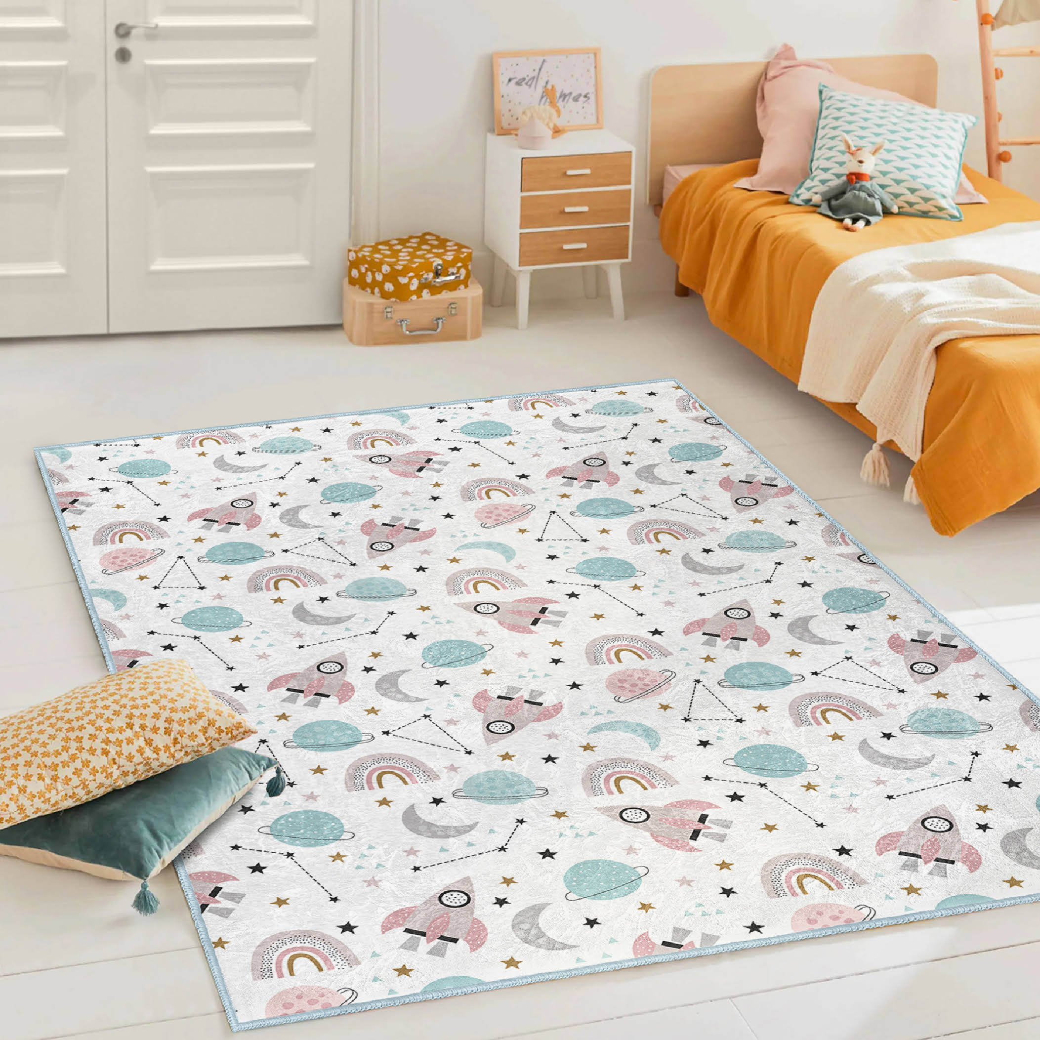 Uzay Temalı Çocuk Halısı: Uzay Gemileri ve Yıldızlarla Dolu Renkli Dikdörtgen Yıkanabilir Kaymaz Taban Halı
