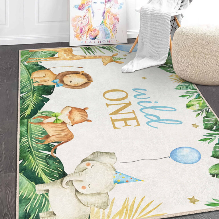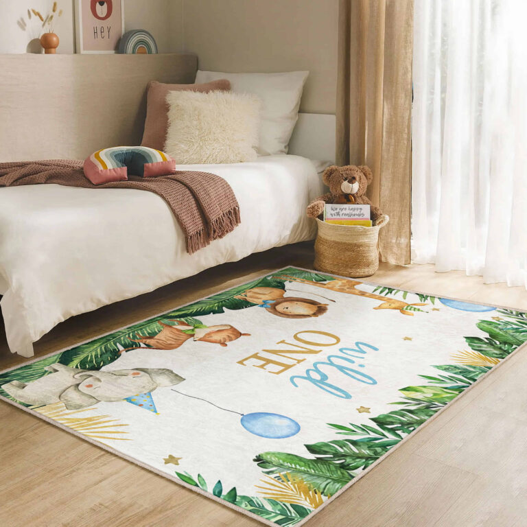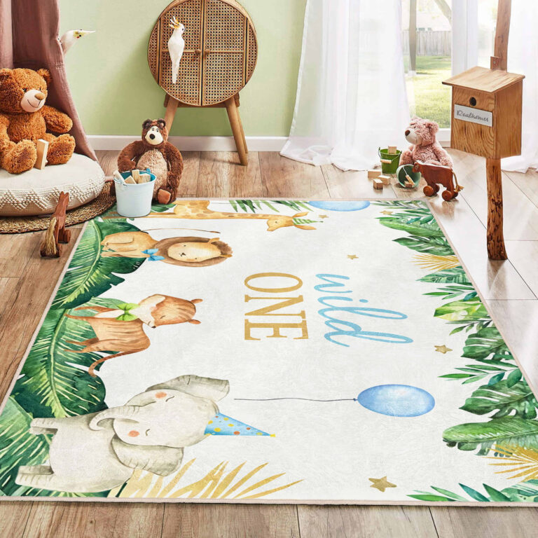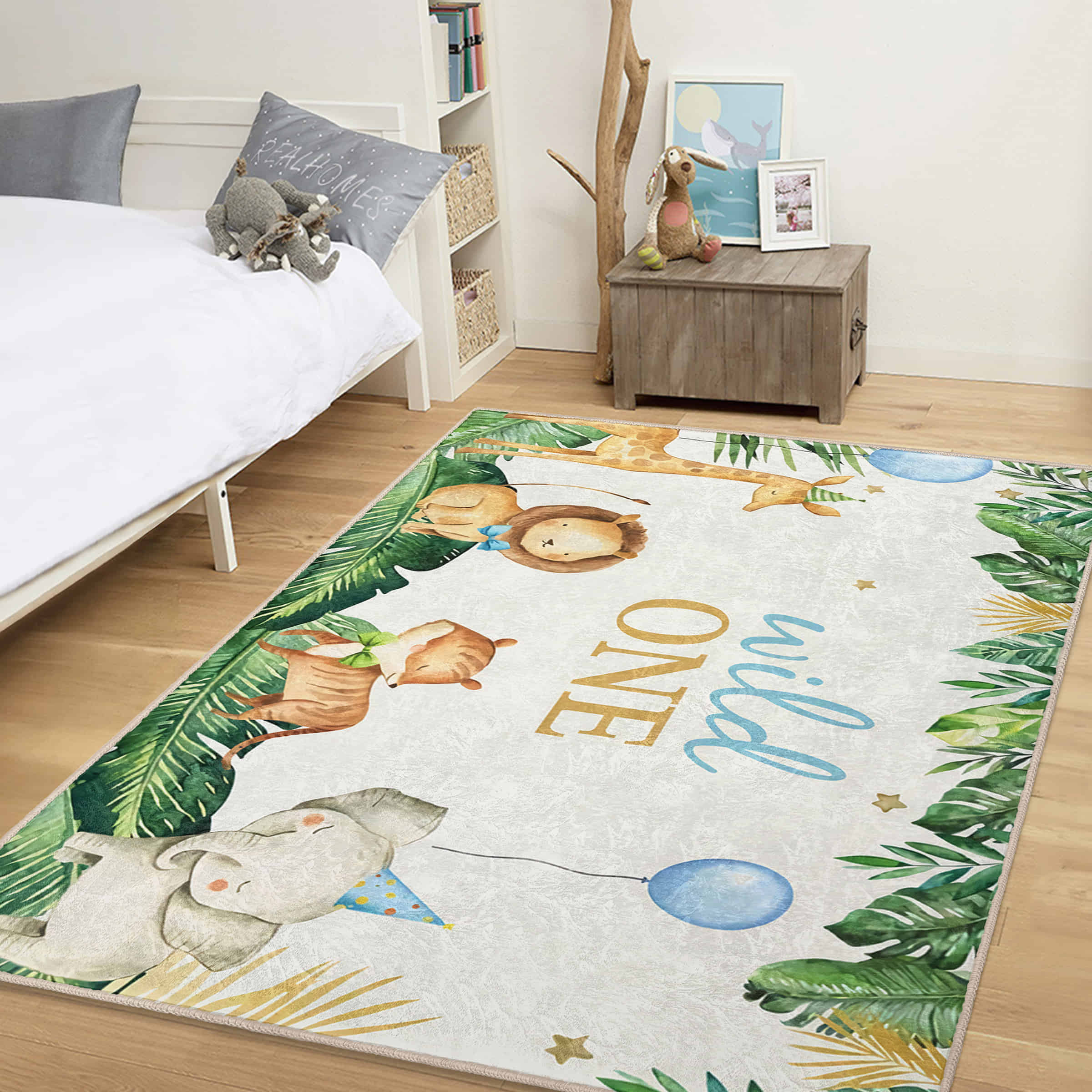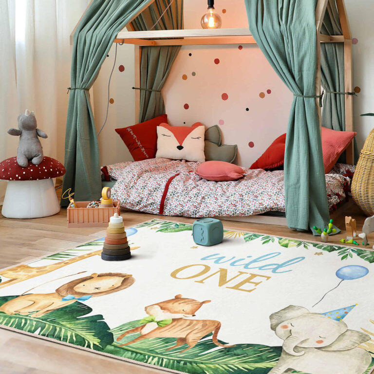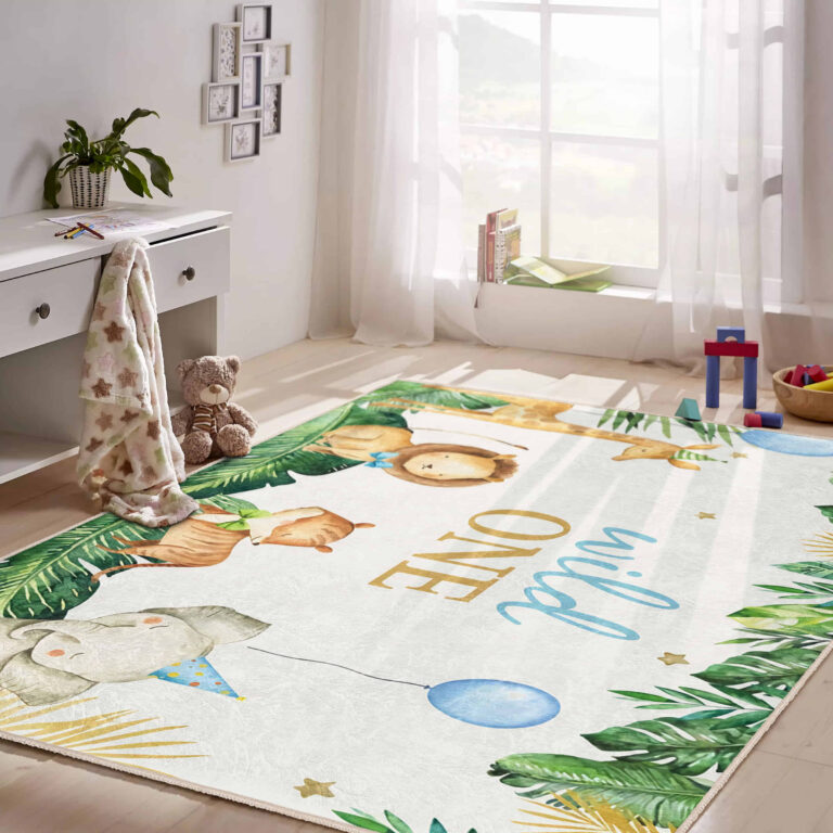 Vahşi Hayvanlar Temalı El Dokuma Desenli Dikdörtgen Çocuk Halısı – Kaymaz Tabanlı Yıkanabilir