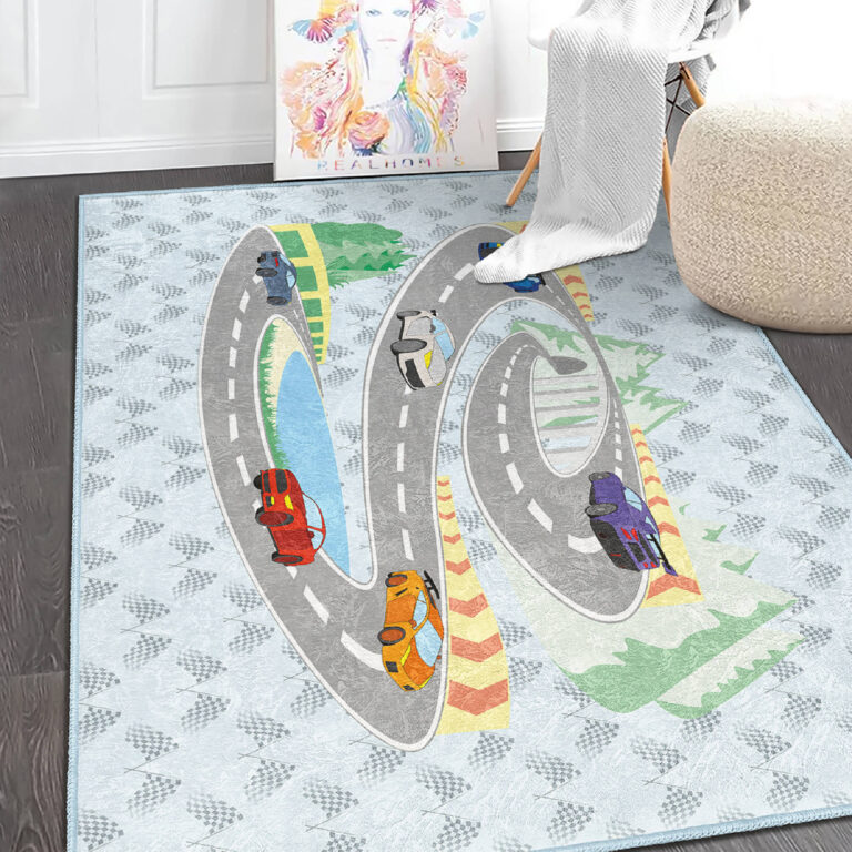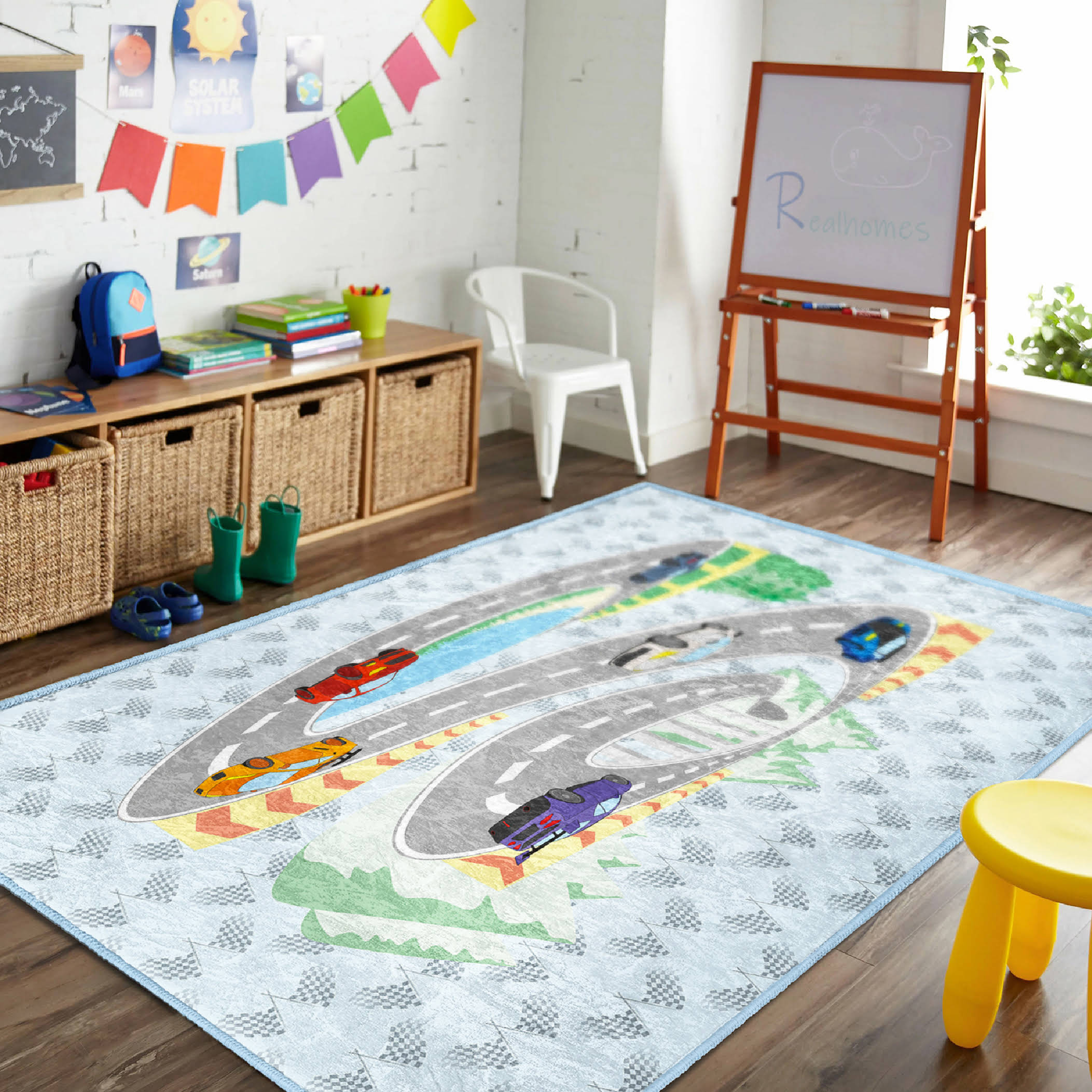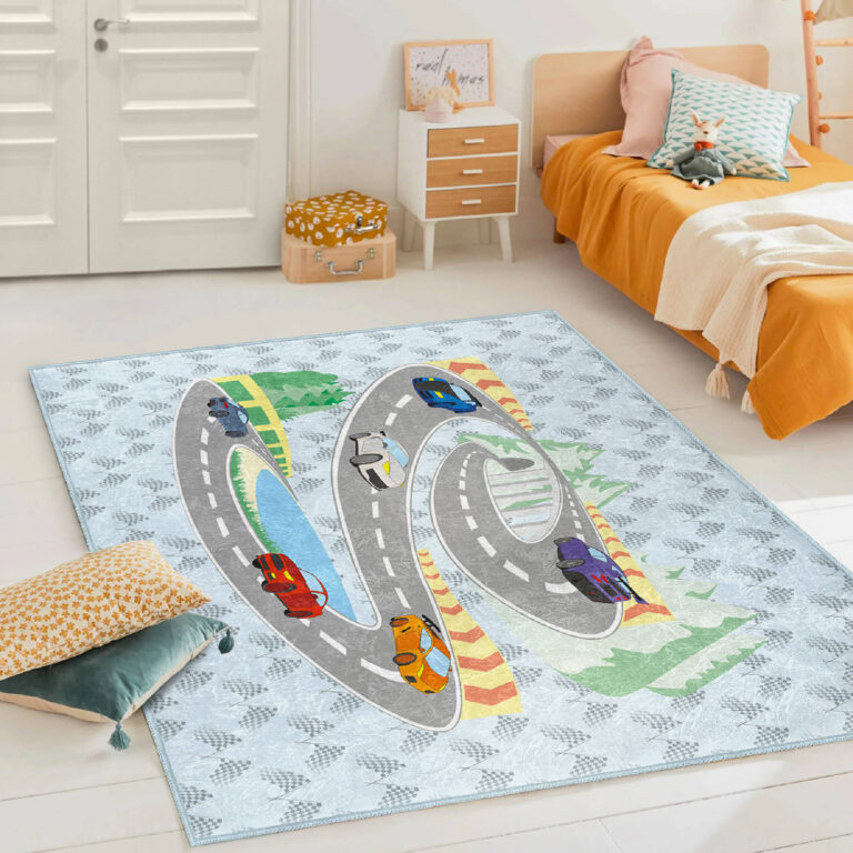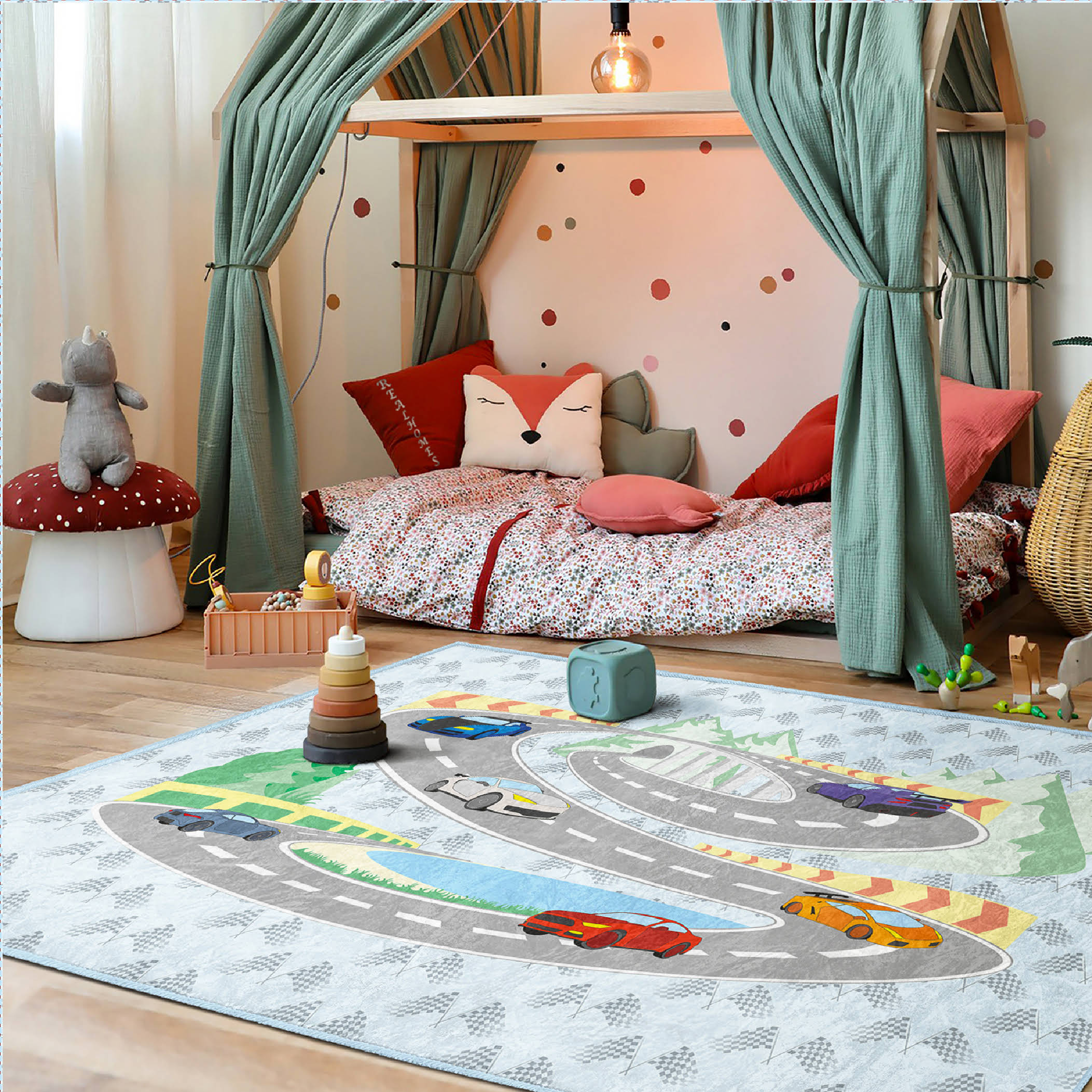 Yarış Araba Desenli Makinede Yıkanabilir Kaymaz Taban Çocuk Halısı
