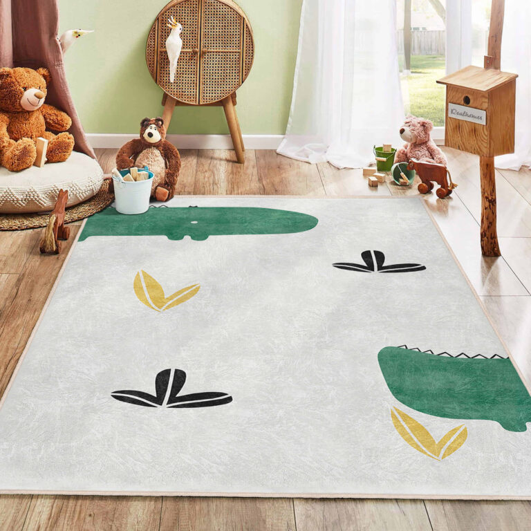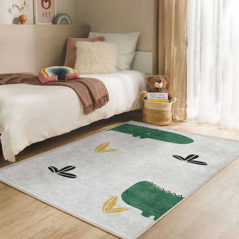Yeşil Mavi Renkli Dinamik Dinozor Desenli Dikdörtgen Çocuk Halısı – Kaymaz Tabanlı Yıkanabilir