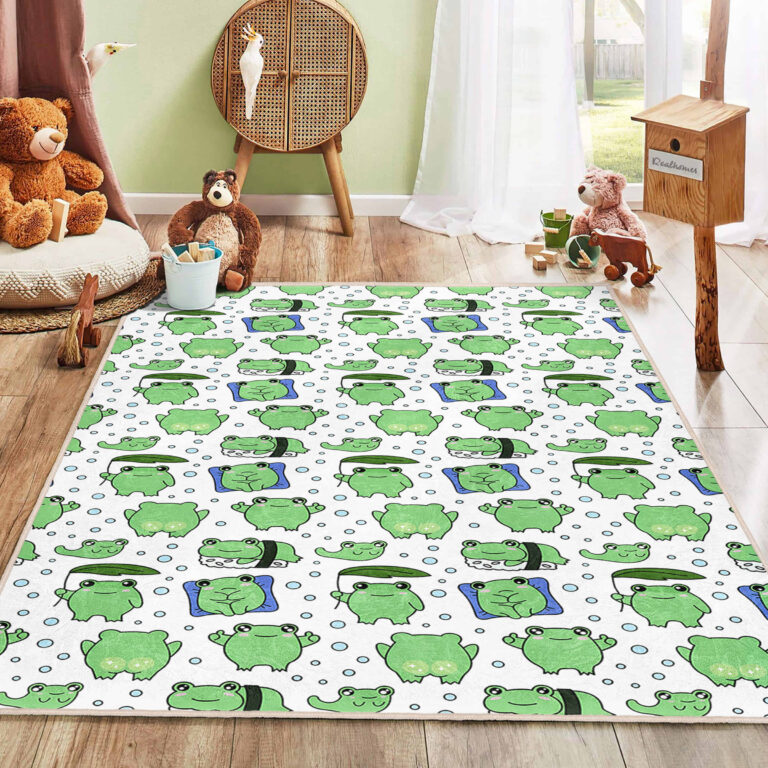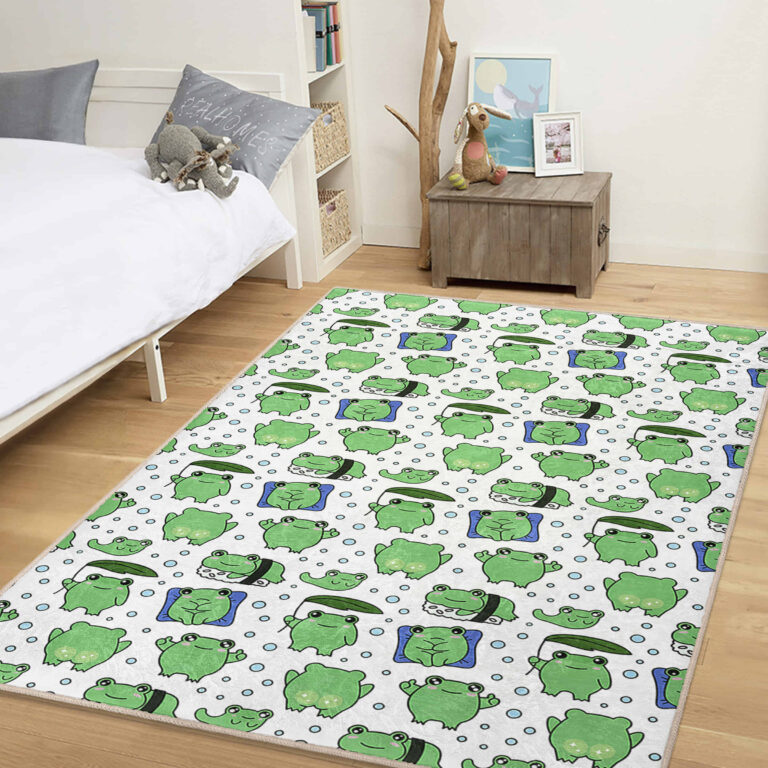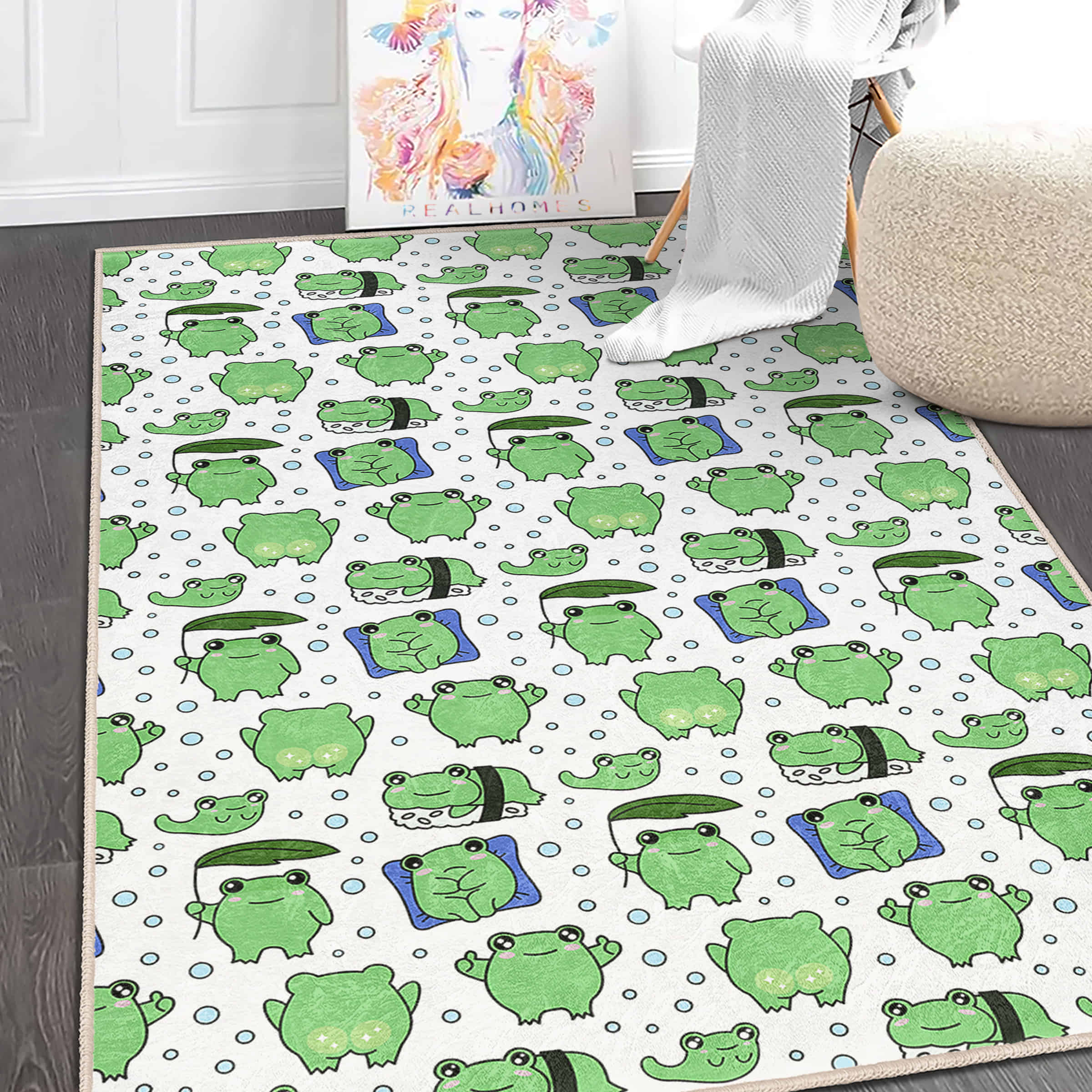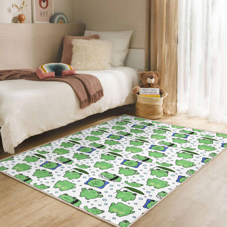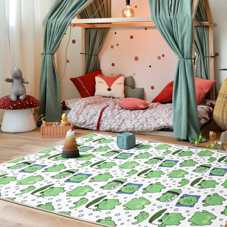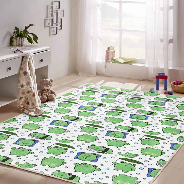 Yeşil Renkli Sevimli Kurbağa Desenli Dikdörtgen Çocuk Halısı – Kaymaz Tabanlı Yıkanabilir Ürün