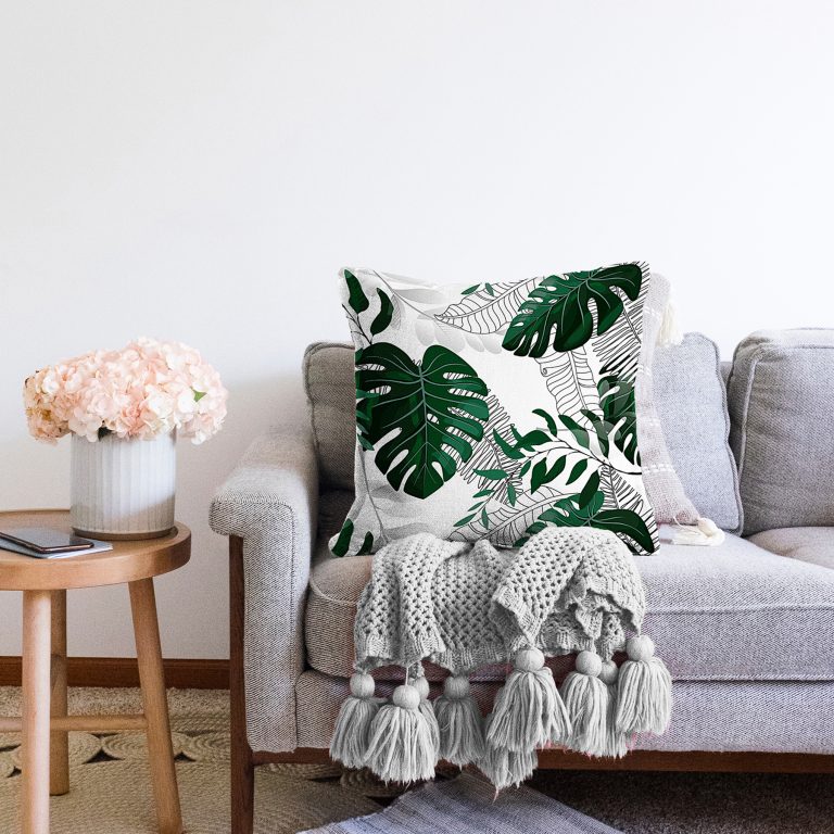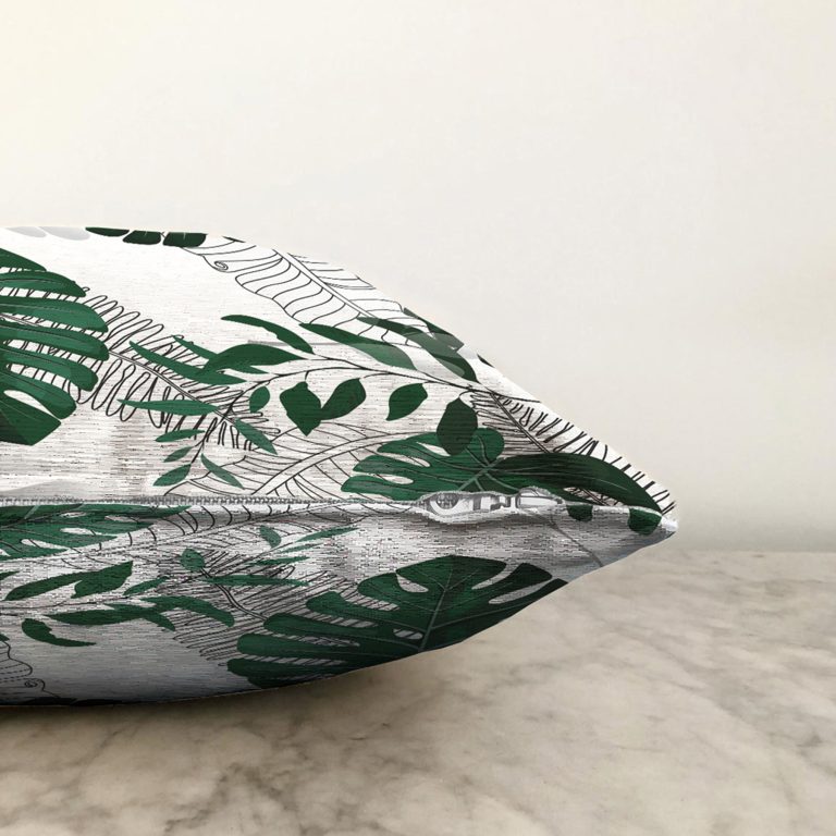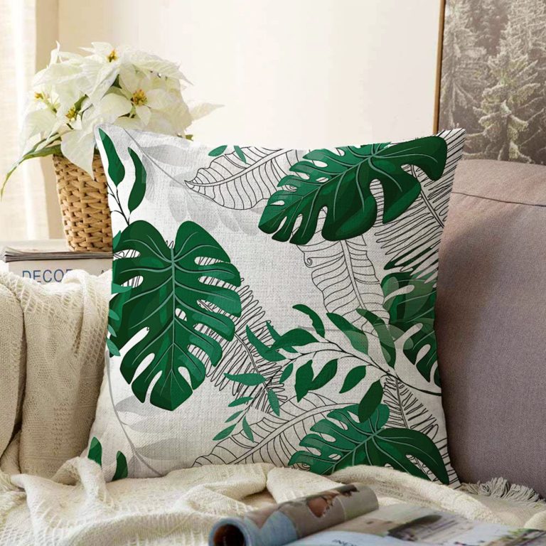 Yeşil Tropik Yaprak Modelli Dekoratif Raşel Yastık Kırlent Kılıfı