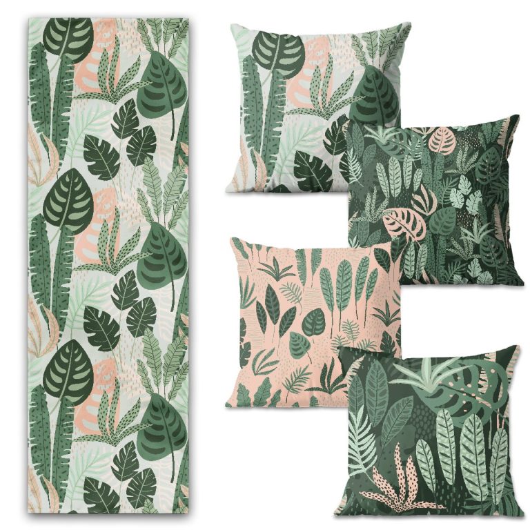Yesil Tropik Yaprak Tasarımlı 4 Kırlent Kılıfı ve Runner Seti
