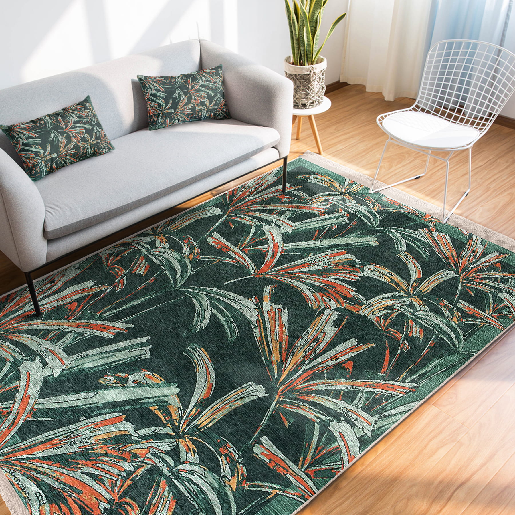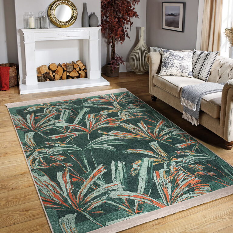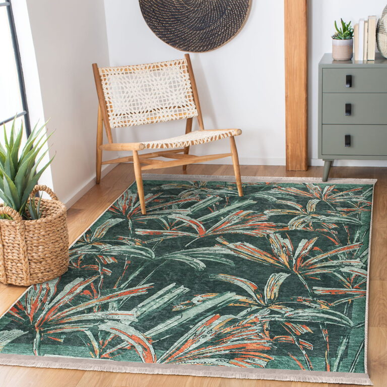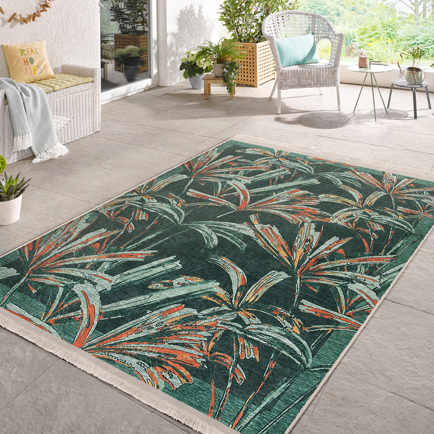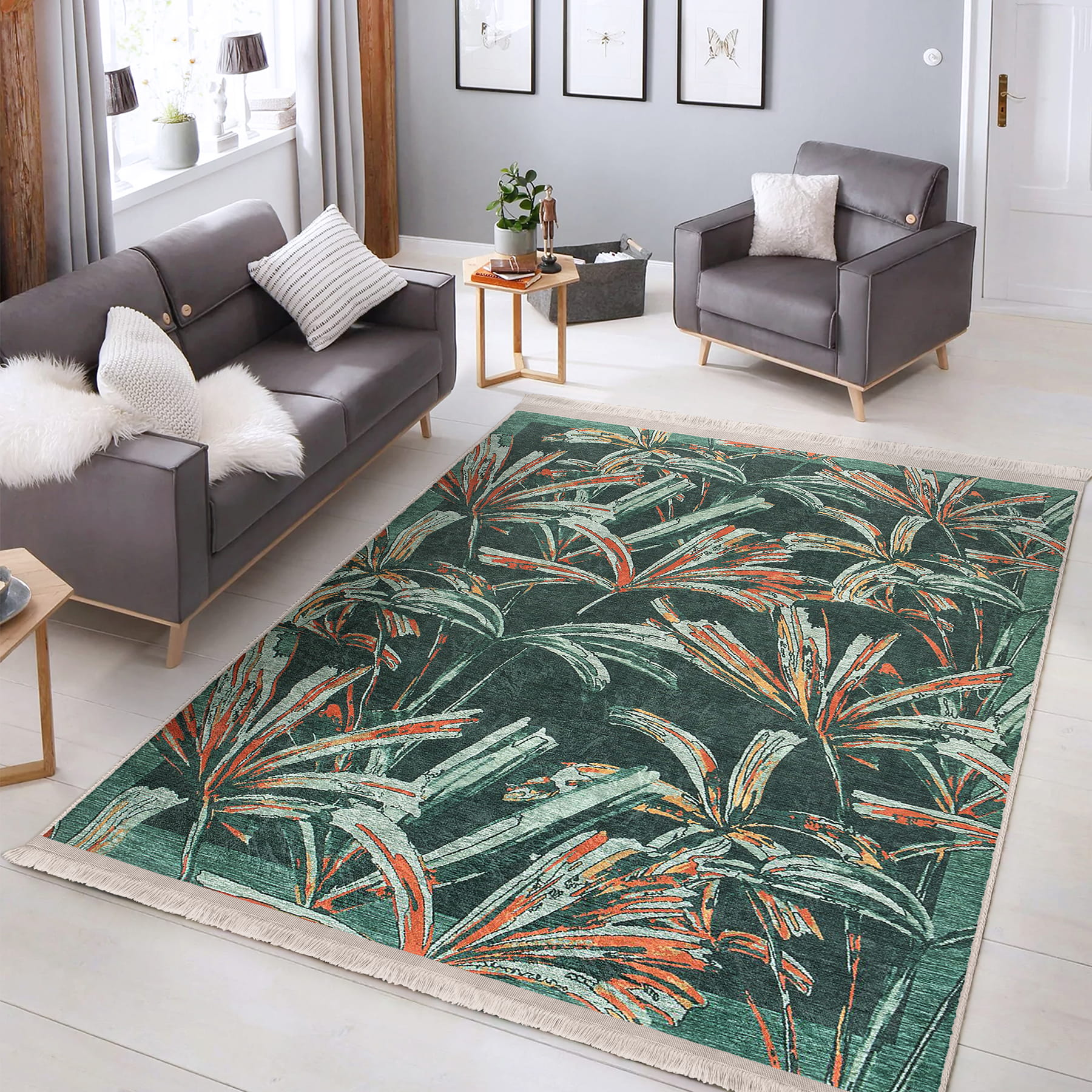 Yeşil Zeminde Çiçek Motifli El Dokuma Desenli Summer & Fresh Floral Dış Mekan & Outdoor Mutfak Dijital Baskılı Makinede Yıkanabilir Kaymaz Taban Saçaklı Halı