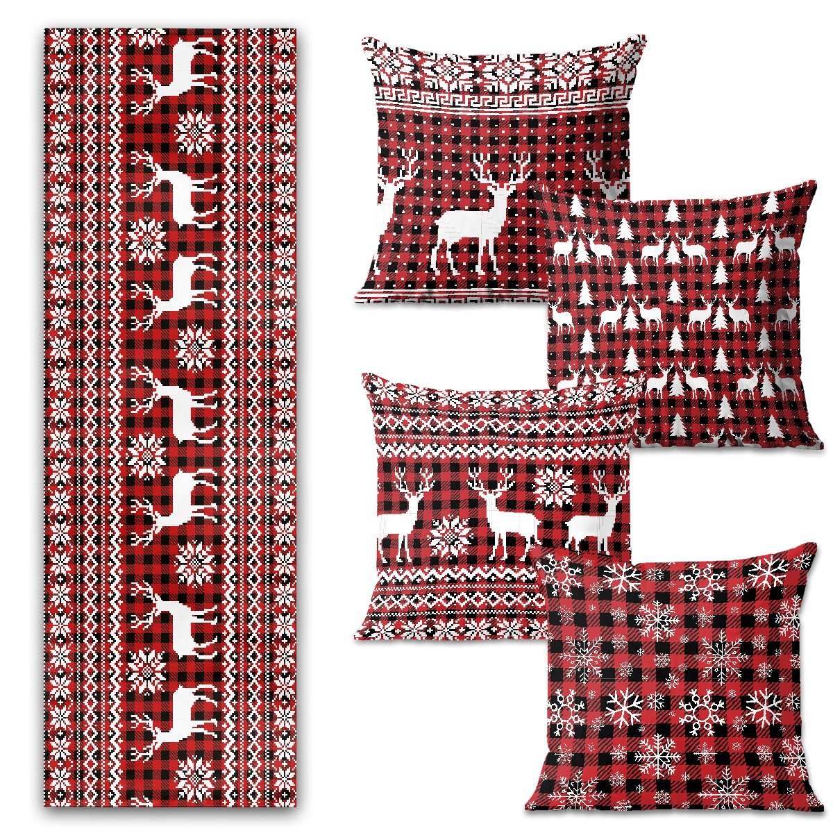 Yılbaşı Geyik Motifli Özel Tasarım 4 Kırlent 1 Runner Seti