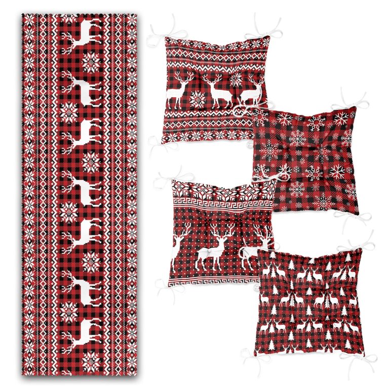 Yılbaşı Geyik Motifli Özel Tasarım 4 Pofidik Sandalye Minderi ve 1 Runner Seti
