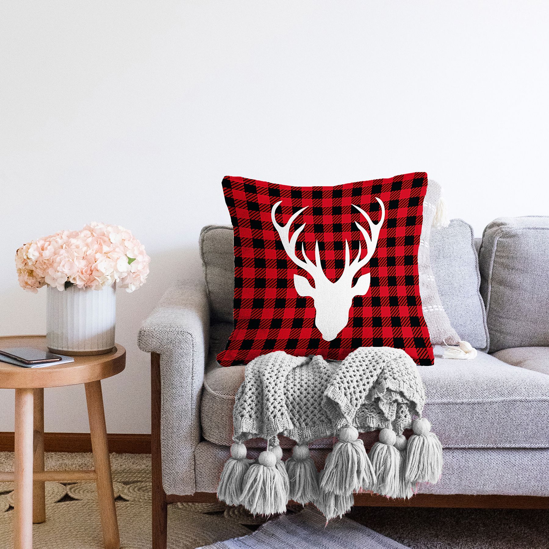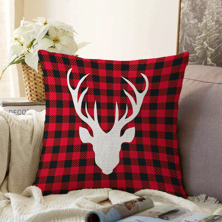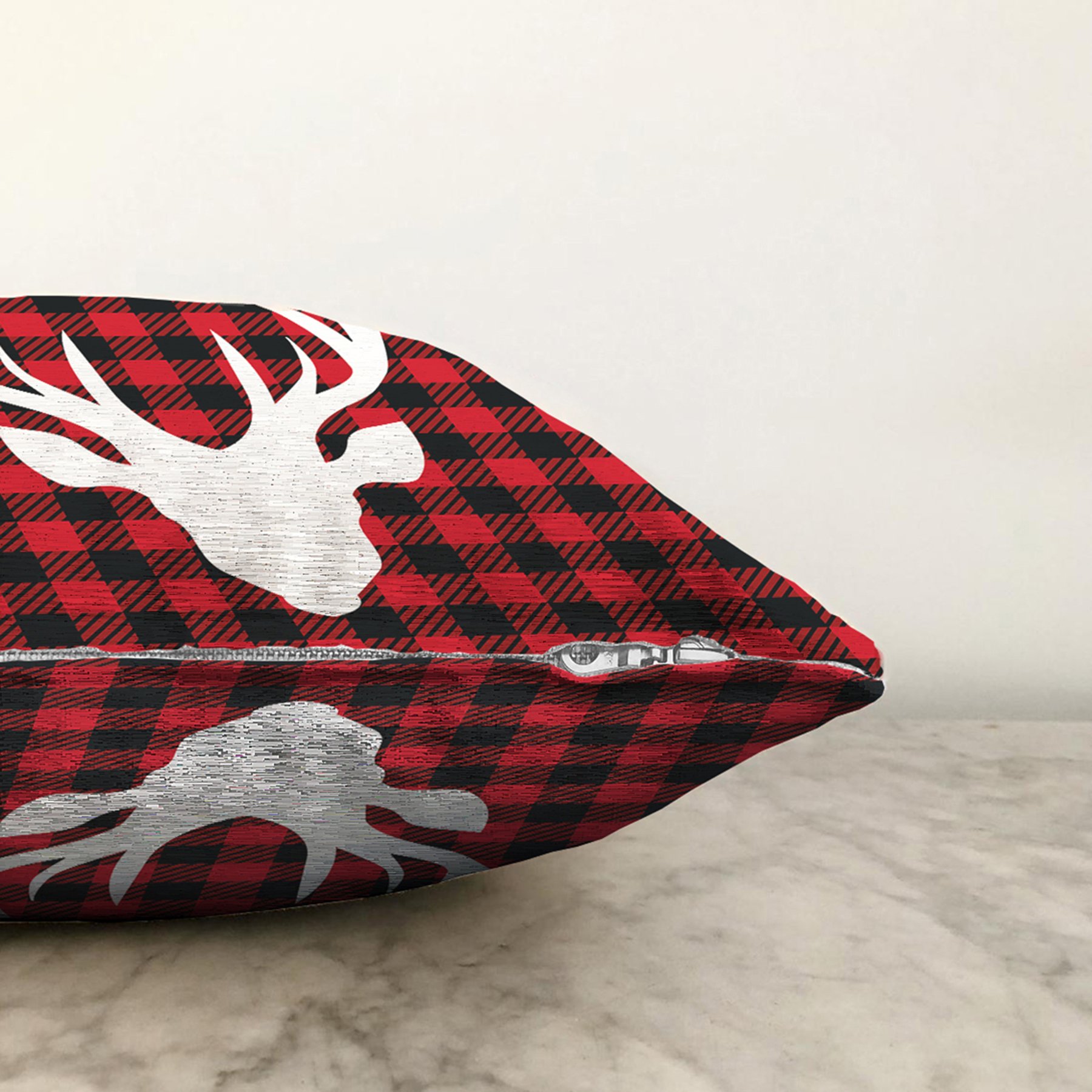 Yılbaşı Temalı Kırmızı Siyah Ekose Zeminli Geyik Motifli Raşel Yastık Kırlent Kılıfı