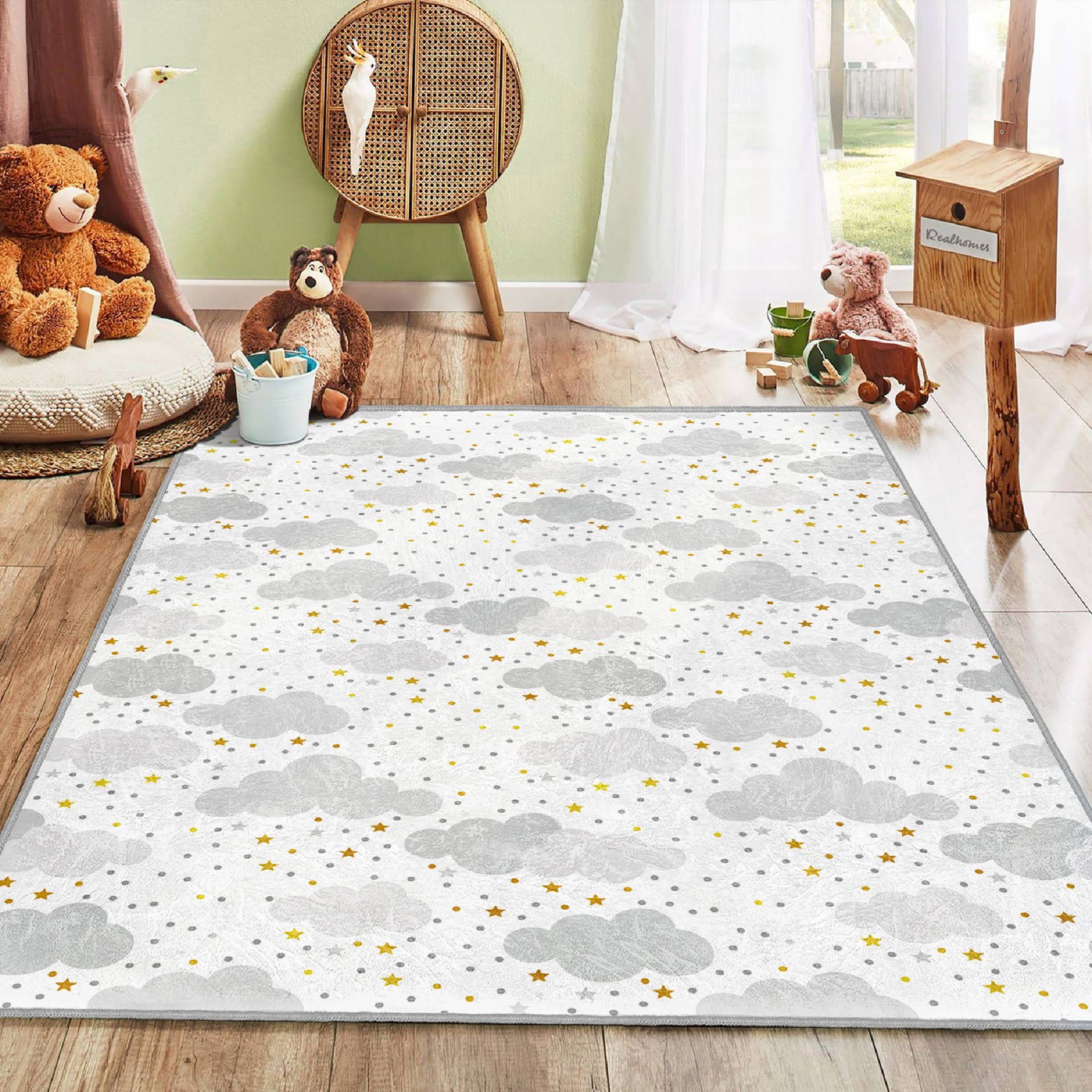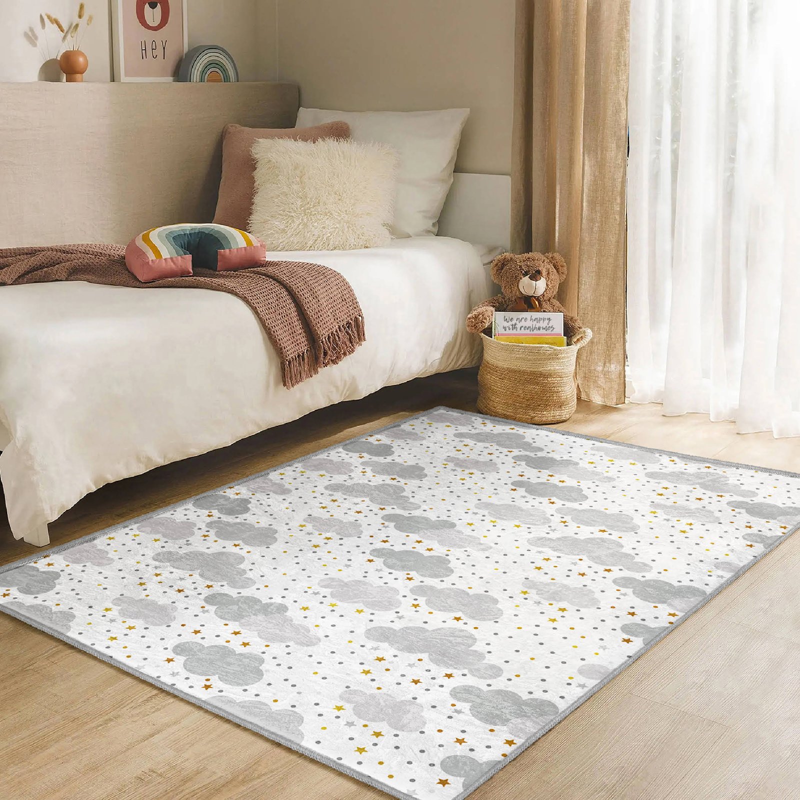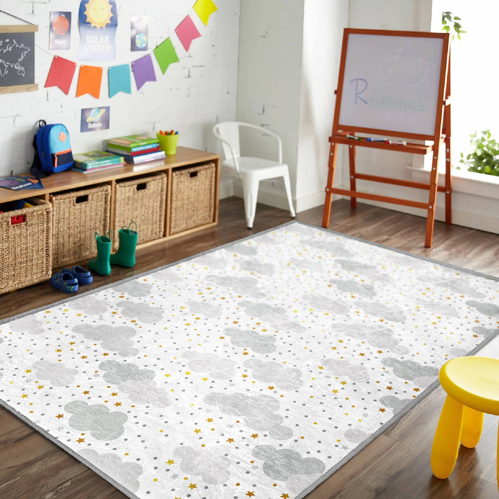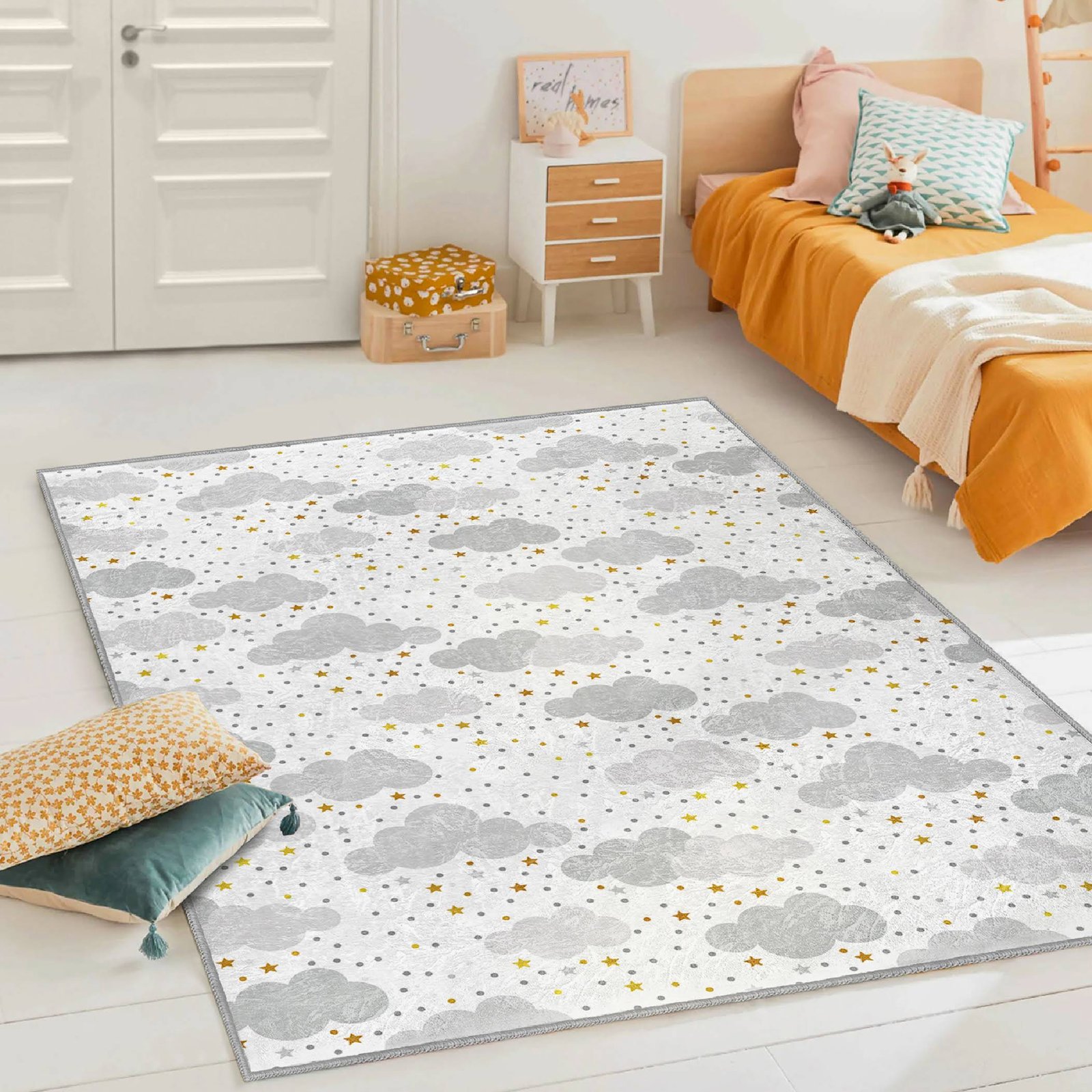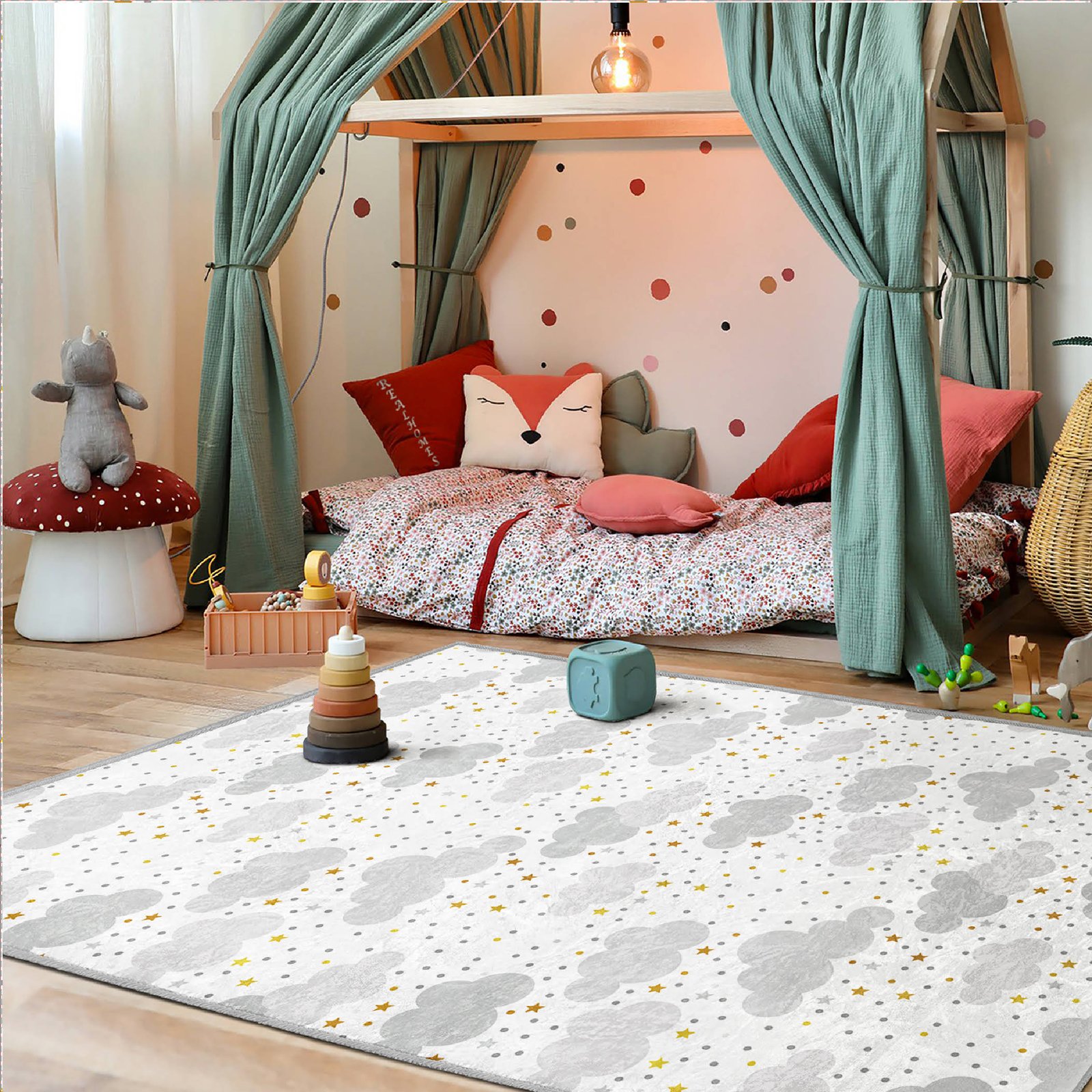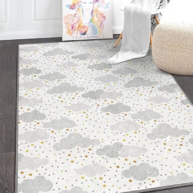 Yıldızlı Bulut Desenli Yıkanabilir Kaymaz Tabanlı Çocuk Halısı – Eğlenceli ve Konforlu Seçenek