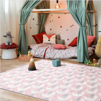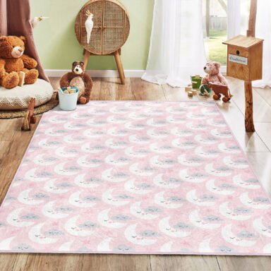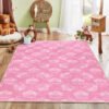 Yıldızlı Gök Mavisi ve Pembe Arka Planda Sevimli Bulut Desenli Çocuk Halısı – Makinede Yıkanabilir Kaymaz Tabanlı Dikdörtgen Halı