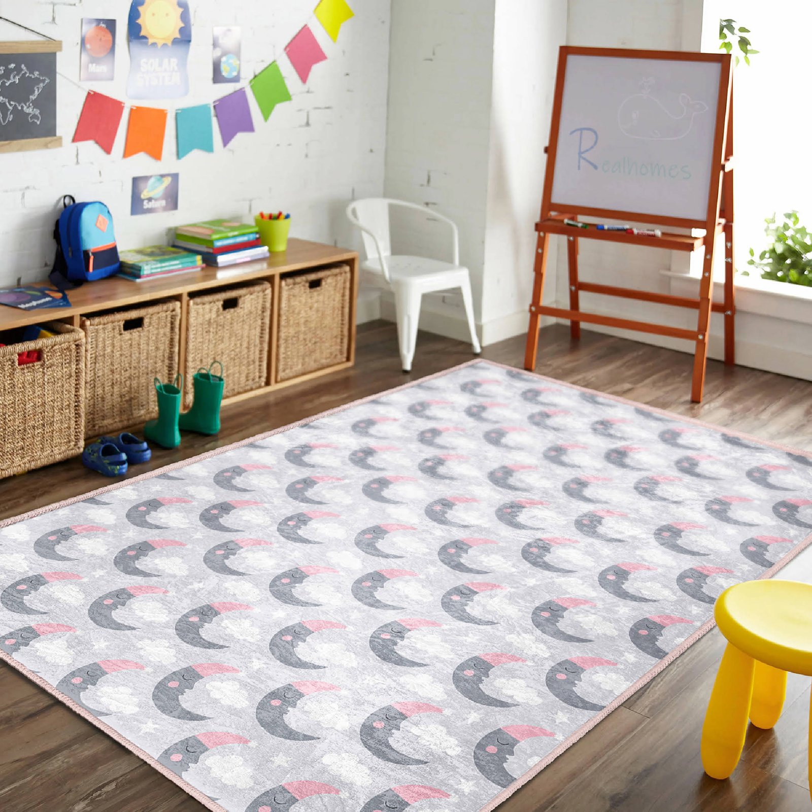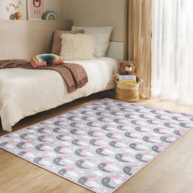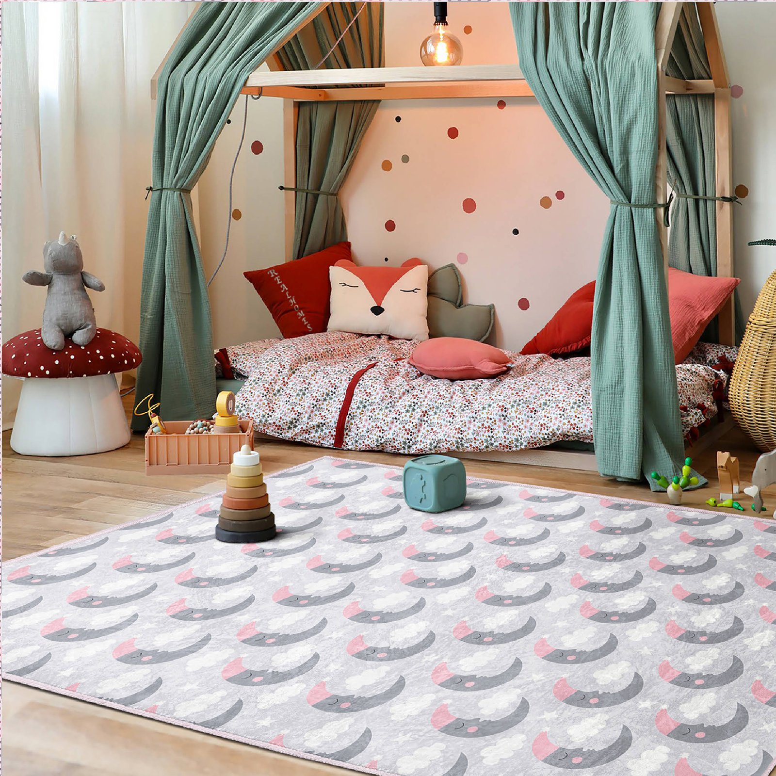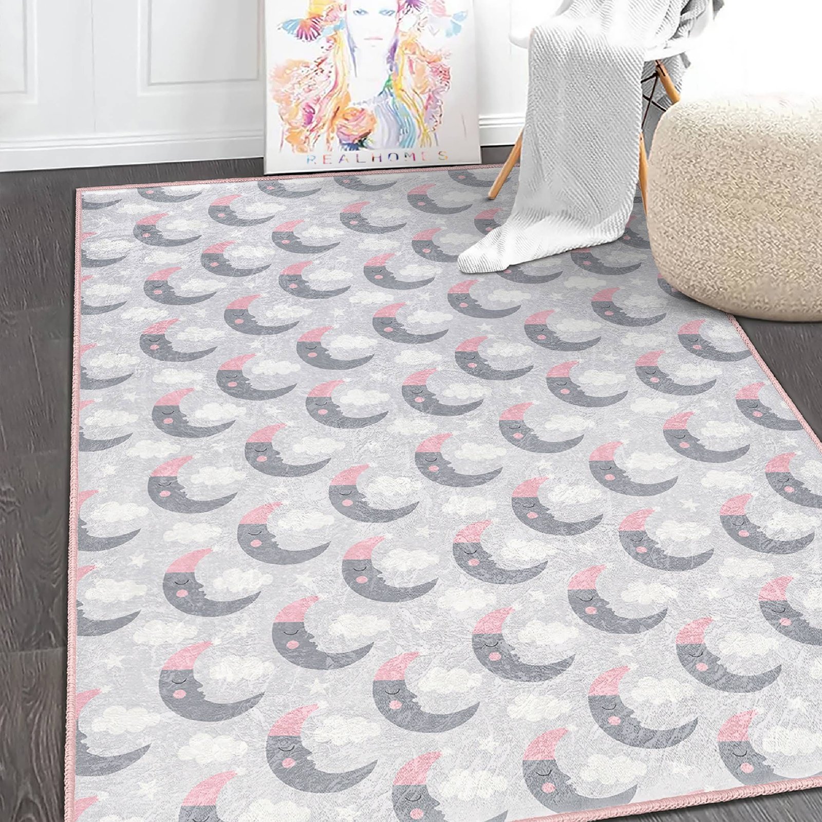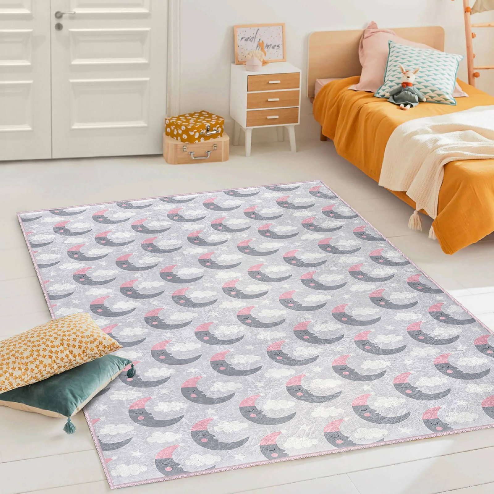 Yıldızlı Gökyüzü Temalı Çocuk Halısı – Kaymaz Tabanlı, El Dokuma Görünümlü Yukarı Doğru Yükselen Gri Ay ve Bulut Deseni